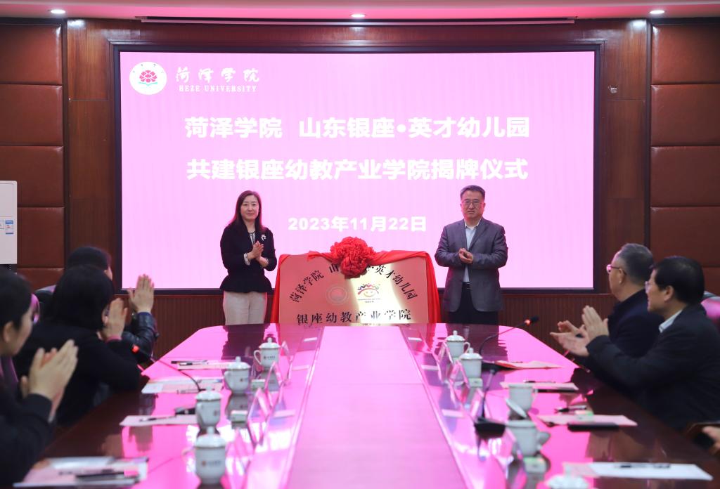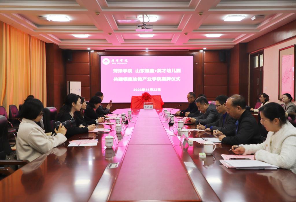 为落实荷泽学院与鲁商集团战略合作协议,深入推进校企合作,服务地方经济社会发展。11月22日上午,菏泽学院与鲁商银座幼教集团在学校第一会议室举行银座幼教产业学院揭牌仪式。菏泽学院党委副书记、校长孙建昌,党委委员、副校长孟令美,银座幼教集团党委书记、董事长袁霞等出席仪式。揭牌仪式由我院党委副书记、常务副院长陈光磊主持。