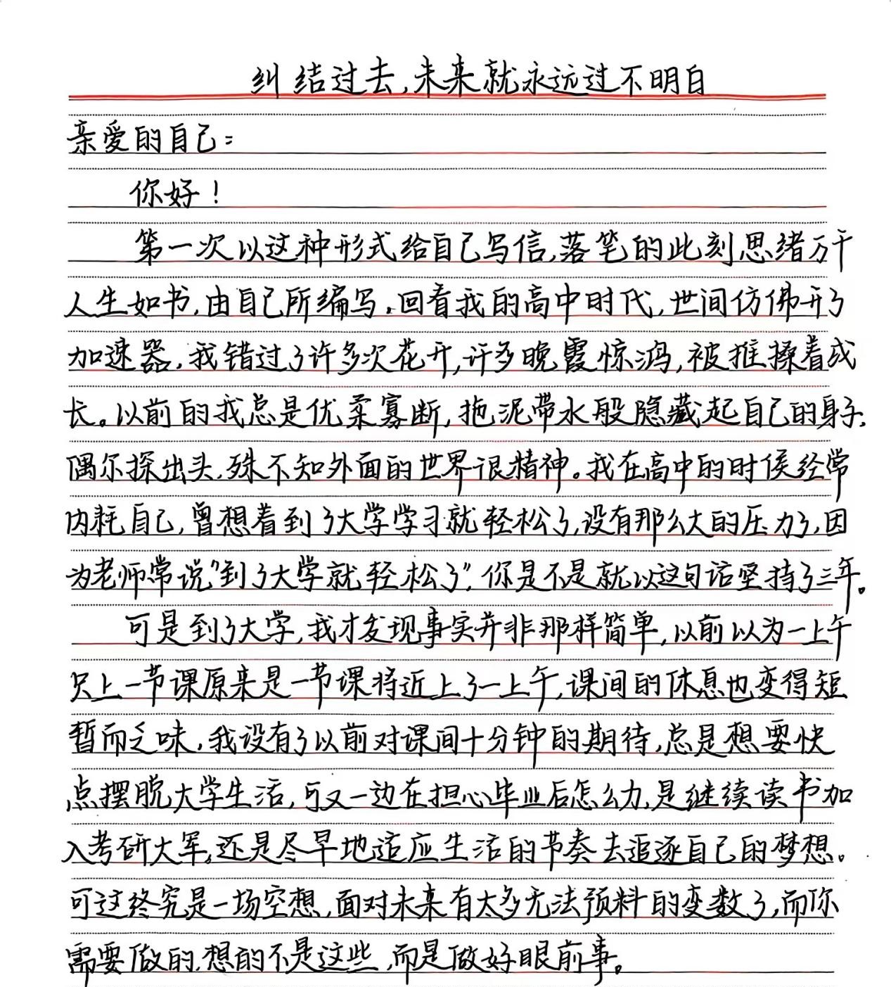 本次活动,参赛者紧扣主题,通过不同角度,抒发对未来的向往,缓解焦虑的情绪。其中,2023级小学教育专业一班吴颖丽以“秋日来信”为题目,描写了在中秋节与家人团圆时的场景,抒发了对父母的思念;2023级学前教育专业对口班刘奕萱以“纠结过去,未来就永远不明白”为题目给自己写了一封信,鼓励自己对未来充满期待,要在最好的年纪做最好的自己。