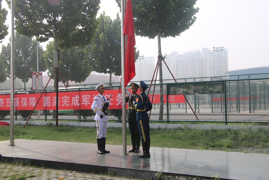 迎着朝阳,我院学子身着军训服整齐列队,目光坚定,精神抖擞。伴随着《义勇军进行曲》,国旗护卫队的旗手们迈着铿锵有力的步伐,手擎国旗,目光坚定、昂首挺胸、阔步前行,一步步迈向升旗台,在庄严雄壮的国歌声中,五星红旗冉冉升起,全体师生齐唱国歌,满怀深情地向国旗行注目礼,共同祝福伟大祖国繁荣昌盛。随后,新生代表、老师代表、校友代表、国旗护卫队代表发言,对新生进行校规校纪教育。鼓励同学们在军训中上好大学的第一堂课,系好第一粒扣子,踏好起始步子,在军训中不断完善自我,超越自我,昂首阔步,开启精彩的大学生活。
