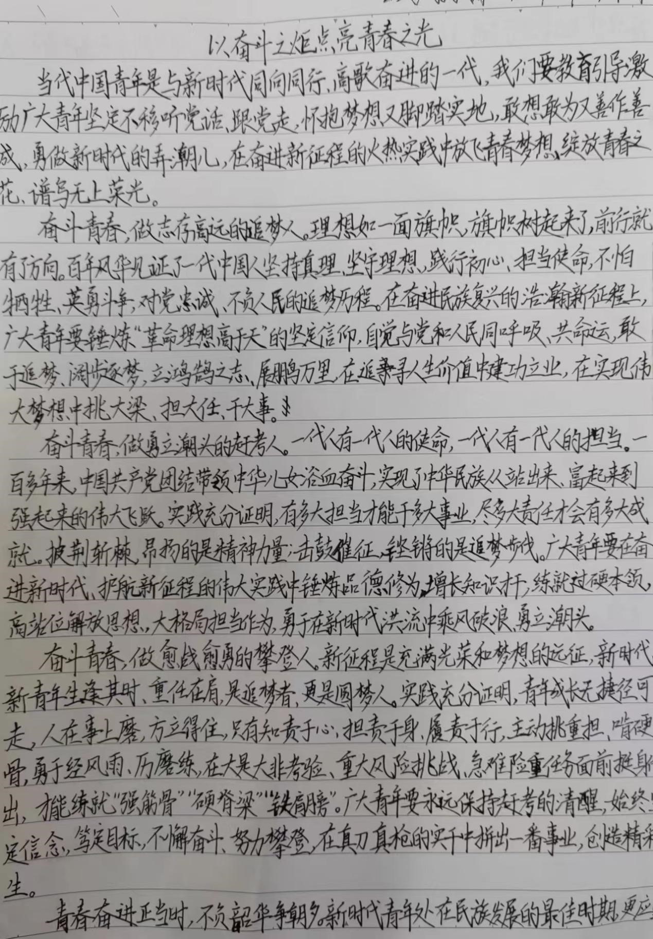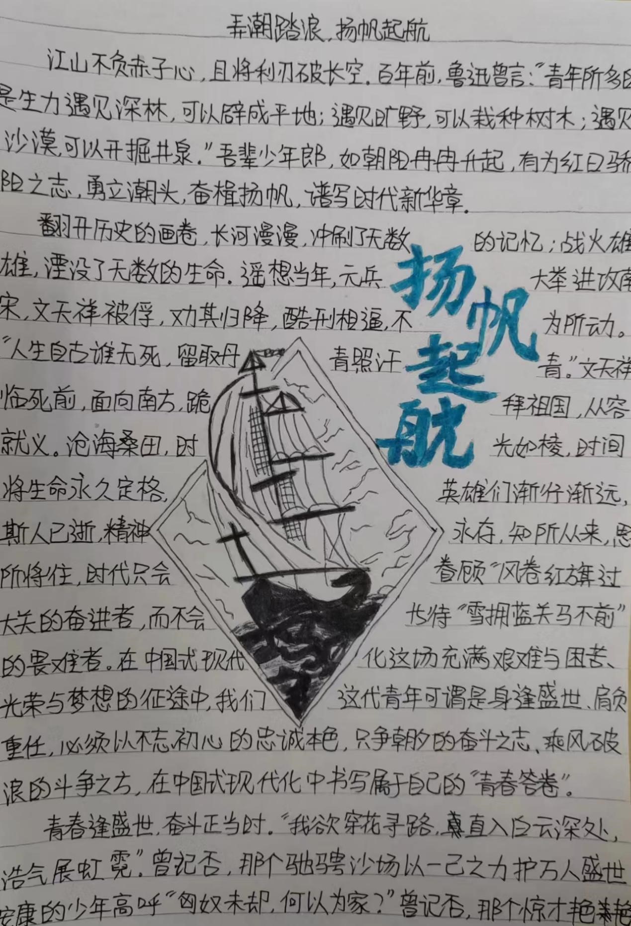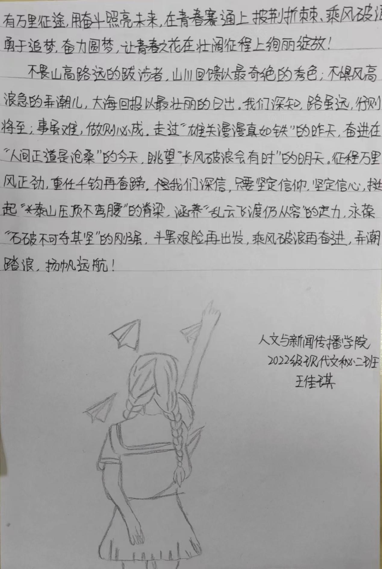 本次活动,参赛者以“青春恰似火,扬帆正当时”为主题,通过不同角度,表达自己对青春的理解与思考。其中,2022级学前教育专业3+4三班侯倩倩以“以奋斗之炬点亮青春之光”为题,字里行间表达了对青春与奋斗的见解,呼吁同学们珍惜当下,为未来努力拼搏;人文与新闻传播学院2022级现代文秘二班的王佳琪图文并茂,展现了青年学生为梦想而奋斗的精神风貌。