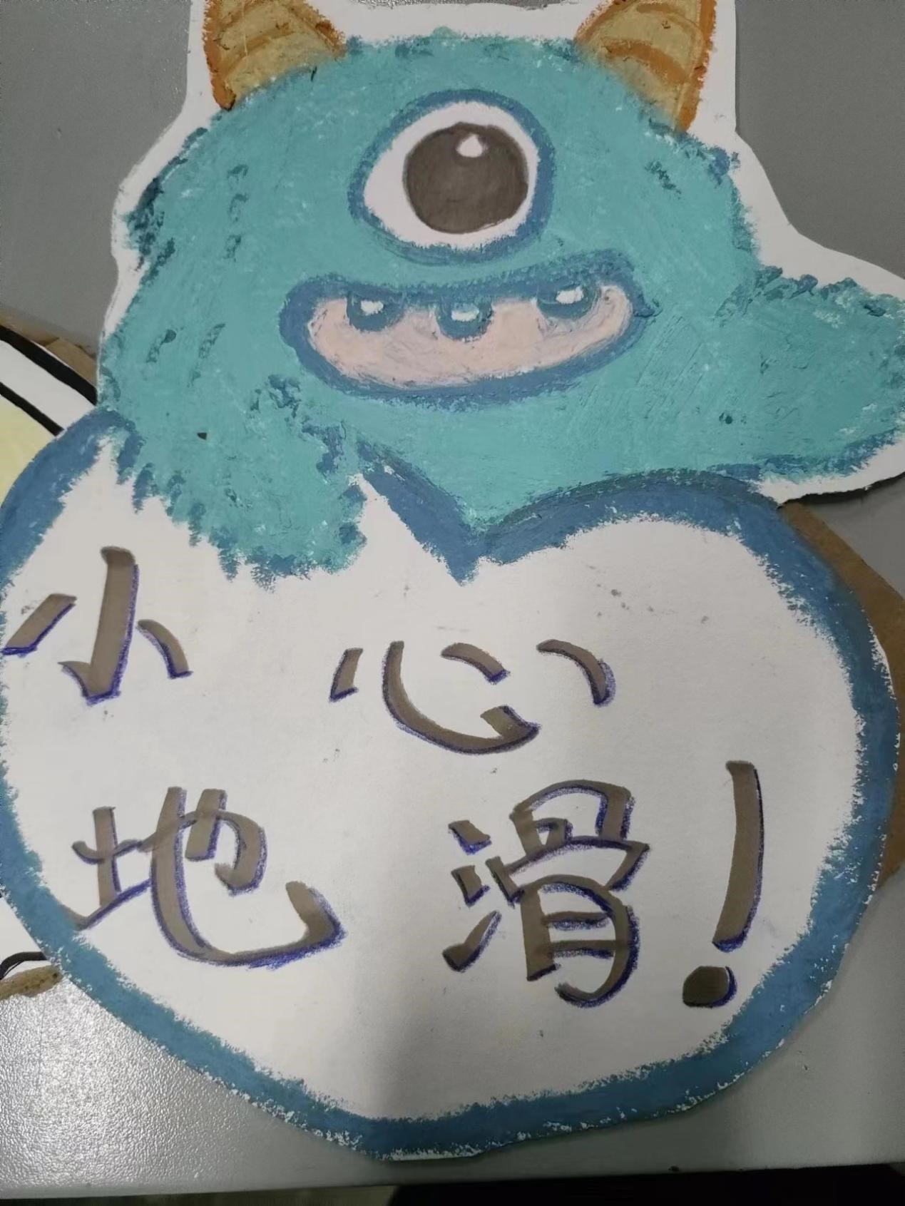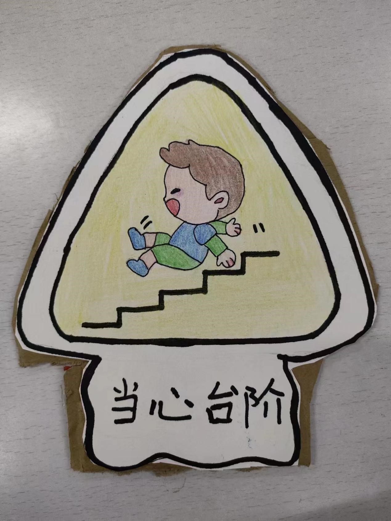 本次活动围绕“安全”为主题,制作创意手工,形式多样。其中,2021级小学科学教育专业一班的李悦恒,以小怪兽的形象制作安全标牌,古灵精怪,以醒目的文字提醒大家注意脚下,小心地滑;2021级小学科学教育专业一班李双雨的作品描绘出小朋友楼梯跌倒的画面,以生动的形象警示大家要小心危险,注意安全。