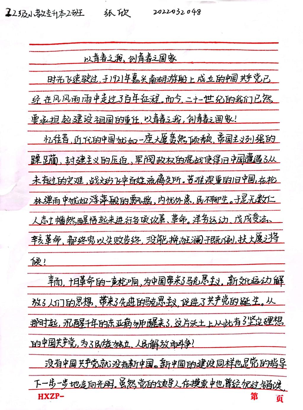 参赛选手以多元、创新的方式分享感悟心得。其中,2022级学前教育专业对口本科班肖瑶书写了一代代中国青年始终与党同心,奋力谱写中华民族伟大复兴中国梦的青春乐章;2022级小学教育专业专升本二班张欣通过对中国共产党发展历程的讲述,呼吁同学们生逢盛世,要以青春之我,创造青春之中国。