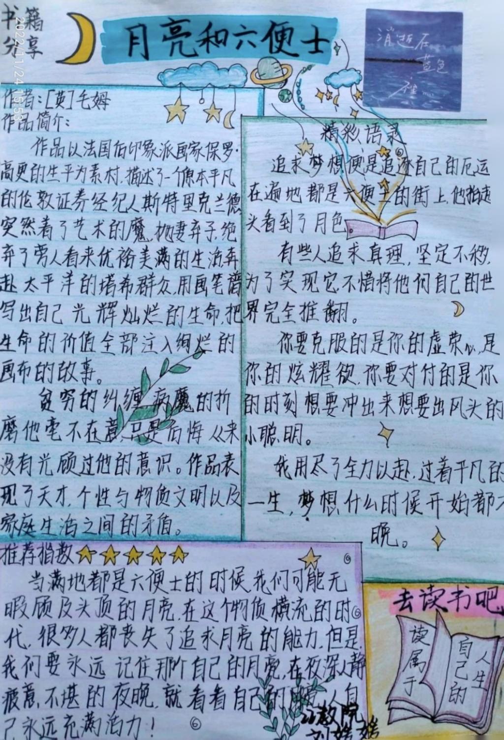 一本好书犹如一个朋友,伴你经历风雨,伴你一路成长,一路净化你的心灵,让我们一起来来看看同学们的书籍分享吧!2021级小学教育专业3+4二班孙语晗用简洁的画风、朴实的文字从不同角度抒发了自己对《狼王梦》的所思、所想、所感,带领同学们深切感悟坚持不懈、勇往直前的精神;2022级学前教育专业3+4一班刘媛媛分享了《月亮与六便士》,其中“追逐梦想便是追逐自己的厄运,在遍地都是六便士的街上,他抬起头看见了月色。”获得了强烈共鸣,同学们积极讨论,分享各自的读书感受。
