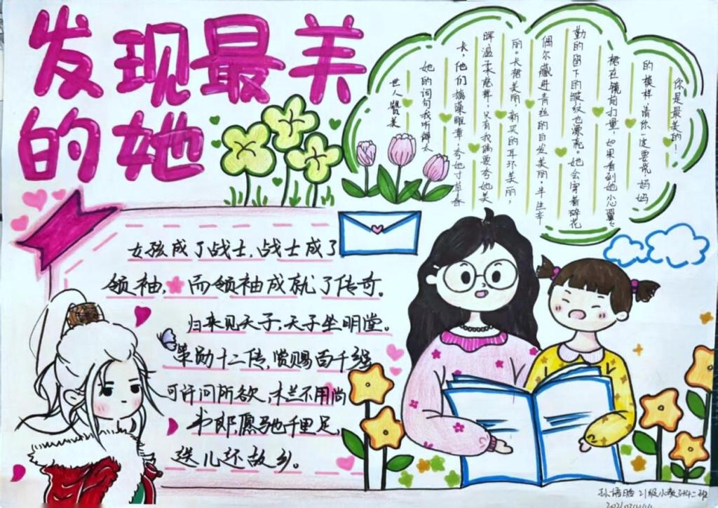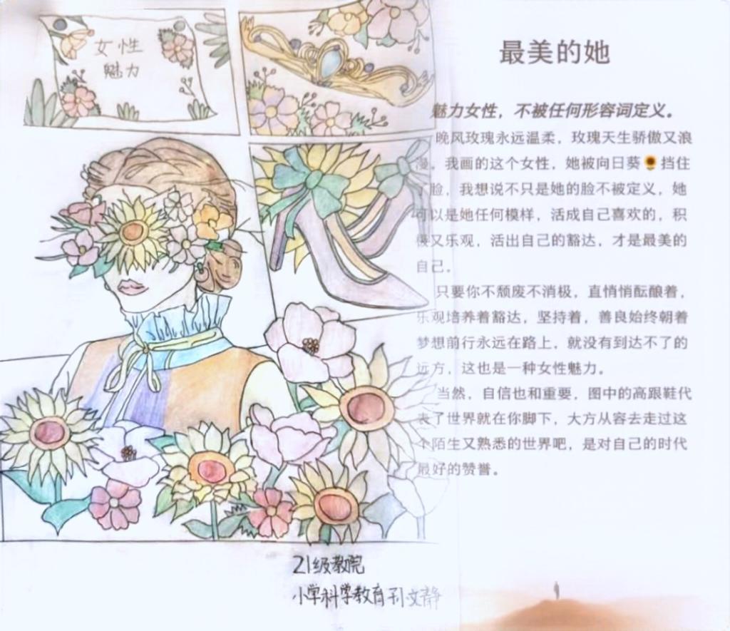2021级小学教育专业3+4二班的孙语晗通过流畅的线条和温馨的文字,将作品《发现最美的她》极富意蕴表达出来;2021级小学科学教育专业二班孙文静将心中的情绪表现在作品《女性魅力》中。