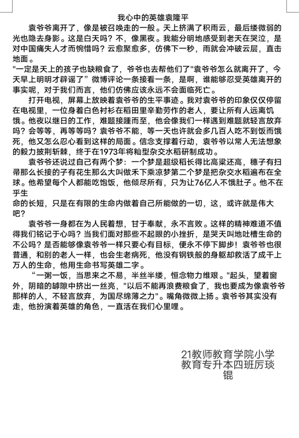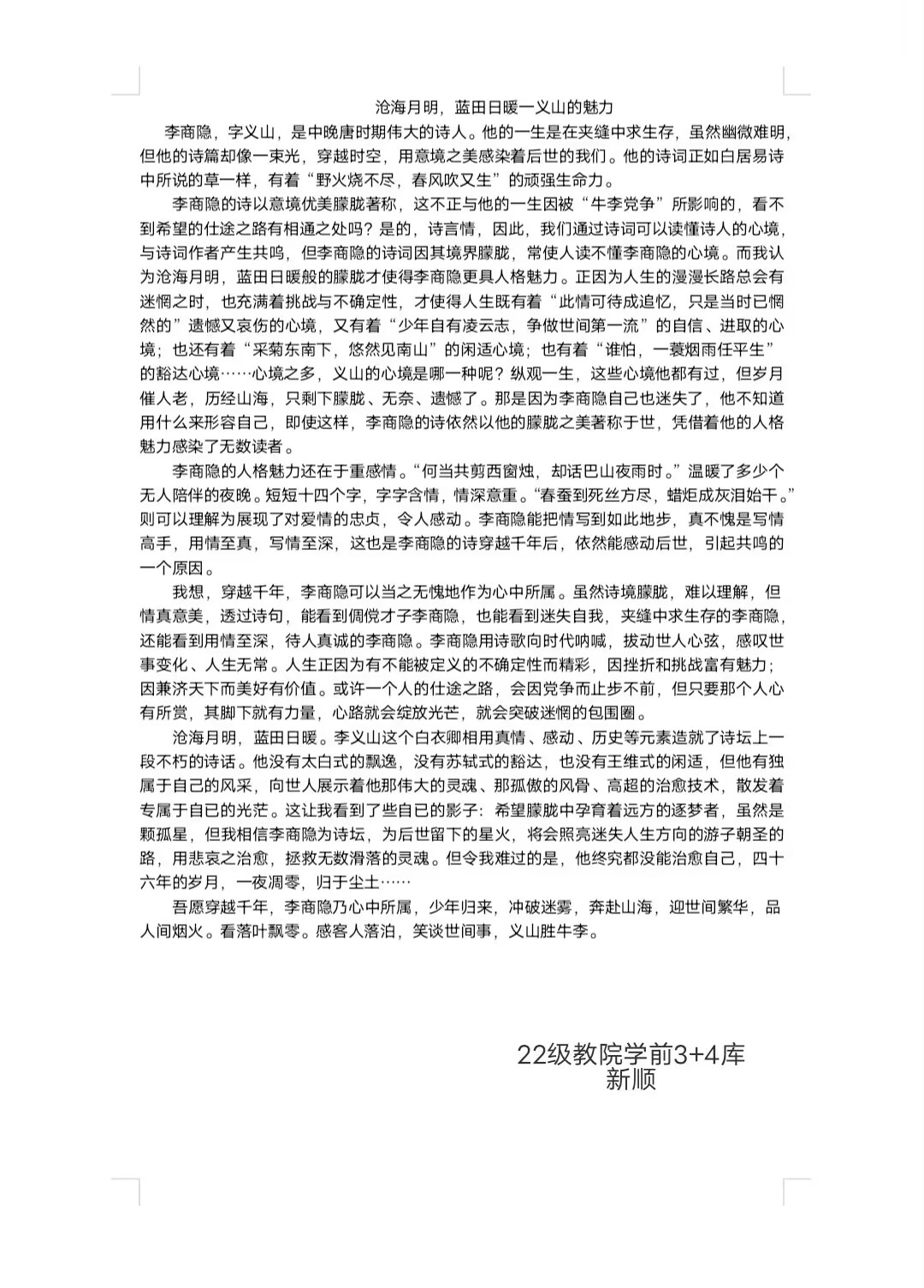 本次活动以文字的形式展开,流露出对文人墨客的真实情感。其中,2021级小学教育专业专升本四班厉琰锟以“一粥一饭,当思来之不易,半丝半缕,恒念物力维艰。”表现出对袁隆平爷爷无限的怀念与崇敬;2022级学前教育专业3+4二班库新顺围绕“沧海明月,蓝田日暖—义山的魅力”展开,道出对唐代诗人李商隐的仰慕与喜爱。