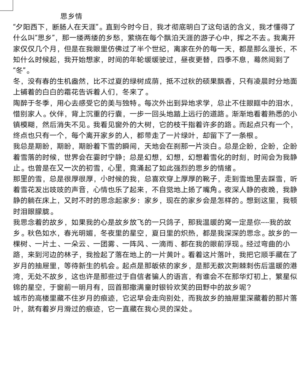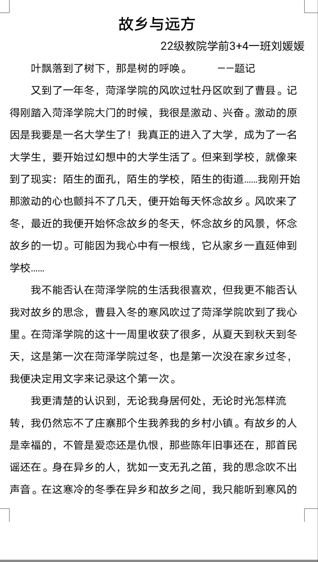 本次活动以主题征文的形式展开,参赛者以极富意境的文采抒发在入冬时节的思乡之情。其中,2022级学前教育专业3+4一班刘媛媛以典雅的文风道出了在落叶深秋的时节心中对故乡与远方的牵念;2021级小学教育专业3+4二班朱雪寒以轻快的语言介绍了自己的家乡,展现了对家乡的无比热爱。