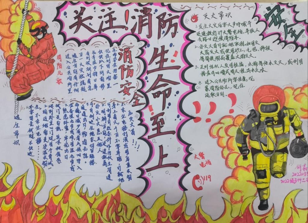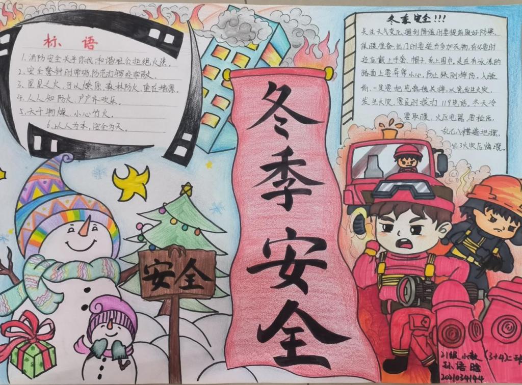 本次活动中,2021级小学教育专业3+4二班孙语晗的作品构图新颖,左侧象征着安全与欢乐的雪人与燃烧的房屋形成鲜明对比,突出了冬日安全的重要性;2022级小学教育专业3+4二班何茹的作品凭借精炼的语言,以精美的画面、创意的设计,生动形象地呼吁大家关注消防安全。