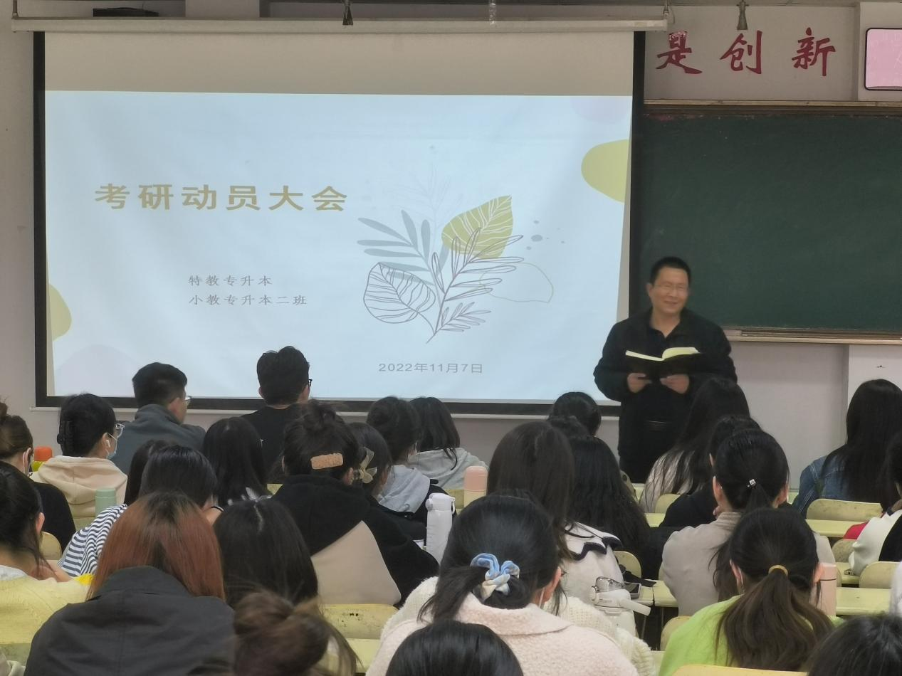 11月7日下午,教师教育学院考研动员大会在8号教学楼412室召开。教师教育学院辅导员吴培启以及2022级小学教育专升本、2022级特殊教育专升本全体学生参加本次会议。