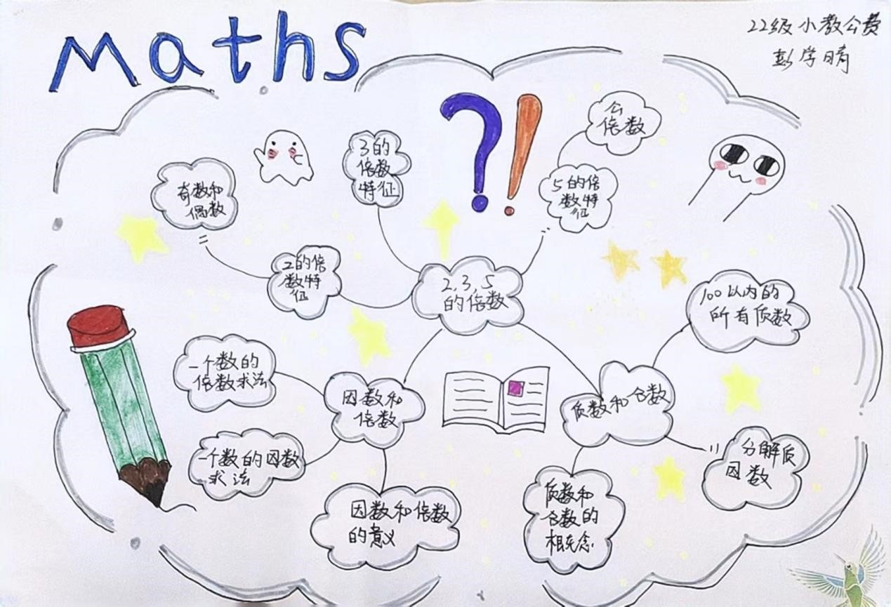本次活动选手以演讲的方式介绍思维导图,内容丰富、形式多样,各具特色。其中,2022级小学教育专业公费班彭学晴以“maths”为主题,从多个方面对“2、3、5的倍数”进行分析,脉络清晰、思维活跃;2022级小学教育专业公费班赵瑞阳以“概率论与数理统计”为主题,从四个方面进行介绍,内容详细简洁,展现出强烈的画面感。