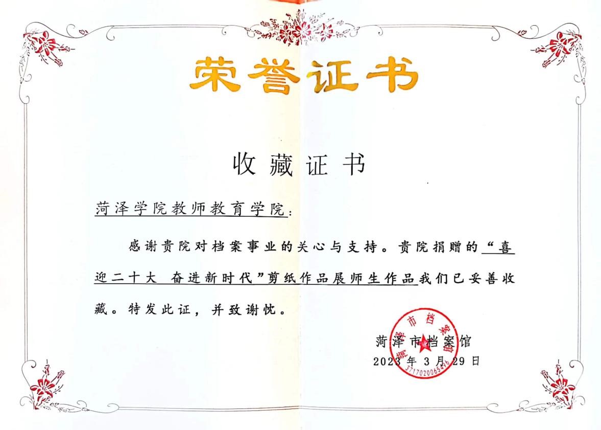 近日,教师教育学院教师黄永荣的“奋进新征程 建功新时代”剪纸作品被菏泽市档案馆收藏。