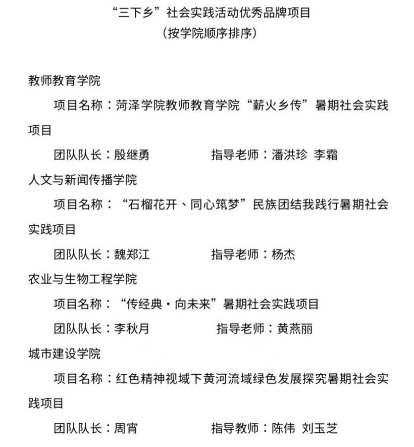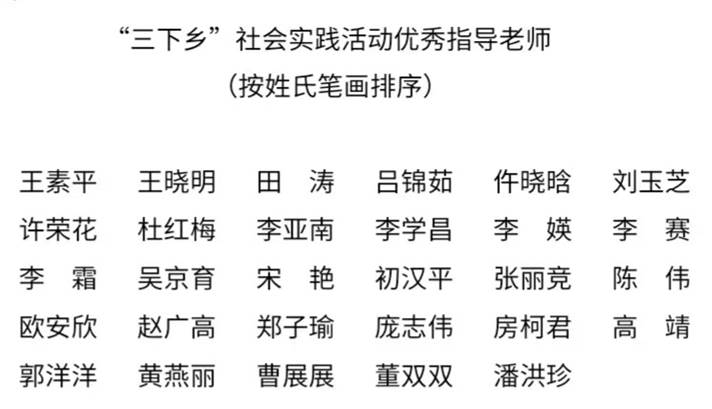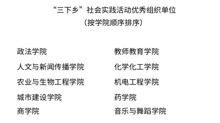 近日,校团委对我校2022年大学生暑期文化科技卫生“三下乡”社会实践活动中表现突出的组织单位、品牌项目、指导教师、优秀个人等进行了表彰。我院获评“三下乡”社会实践活动优秀组织单位;我院“薪火乡传”暑期社会实践项目荣获“三下乡”社会实践活动优秀品牌项目;潘洪珍、李霜获评优秀指导教师称号;殷继勇、张嘉康等31名学子获“三下乡”社会实践活动优秀个人。