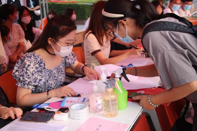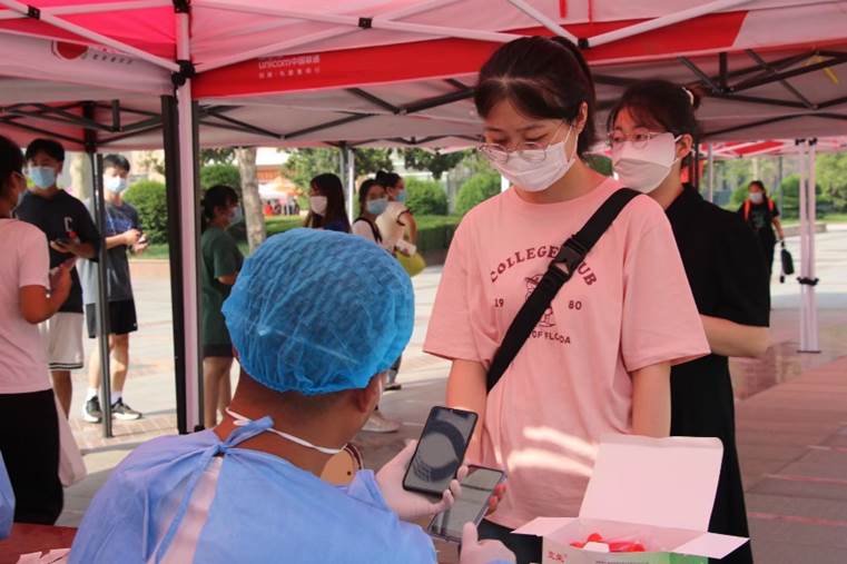 为保障新生安全,落实疫情防控措施,我院入校时组织新生排队进行体温测量、检验健康码等确认,我院志愿者全程佩戴口罩,进行核验学生身份、随身行李消毒等工作,并带领新生间隔一米进行入校核酸检测,为学生提供安全保障。