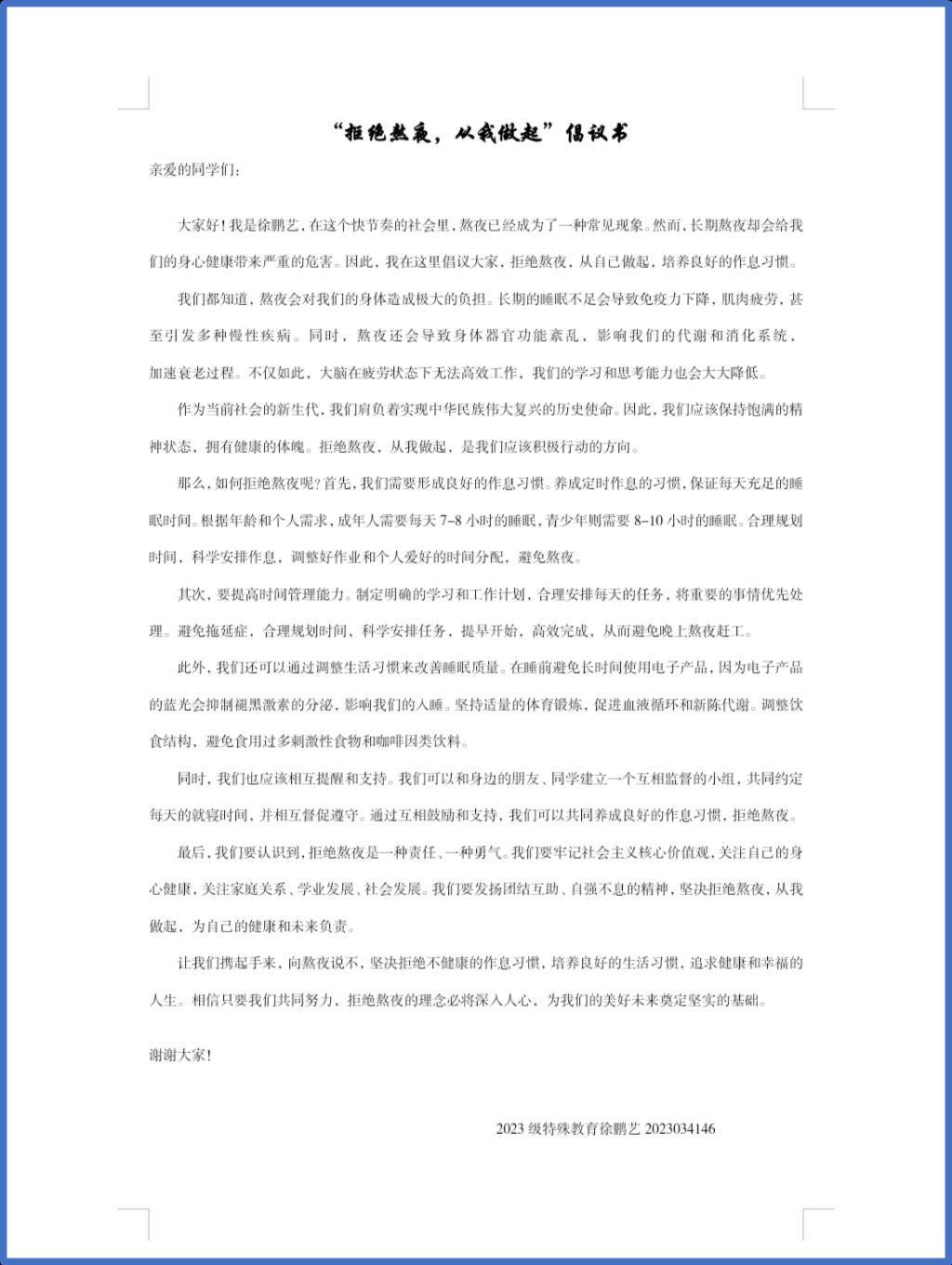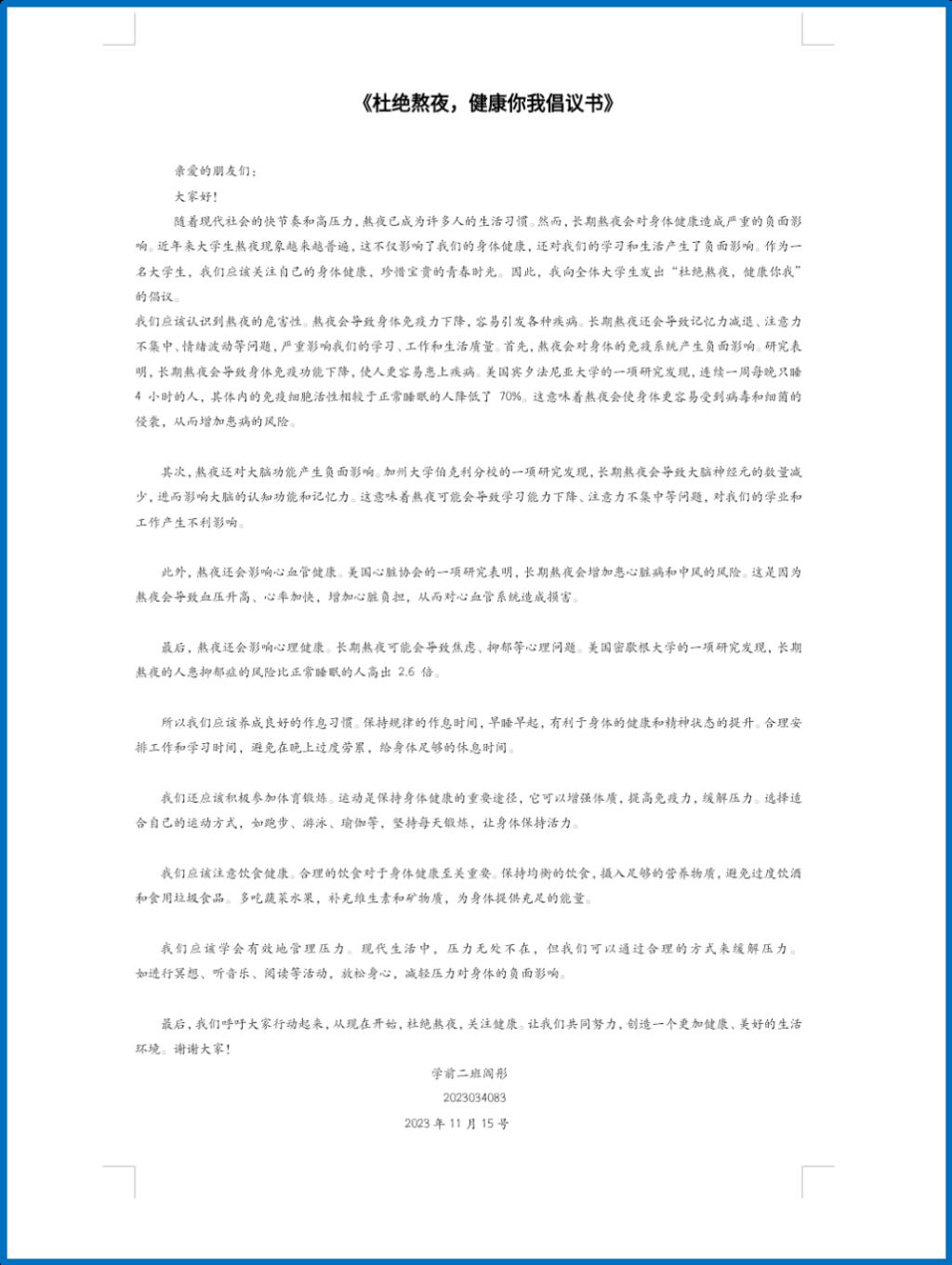 活动中,同学们全面分析熬夜的危害,并提出保持健康的方法。其中,2023级特殊教育专业本科班徐鹏艺的文章层次分明、逻辑清晰,阐述了熬夜对身心健康的危害,呼吁同学们养成规律作息、健康生活的良好习惯;2023级学前教育专业二班阎彤通过列举具体案例,使同学们认识到熬夜对个人产生的负面影响,倡导同学们合理安排时间、避免过度疲劳,保持健康作息。