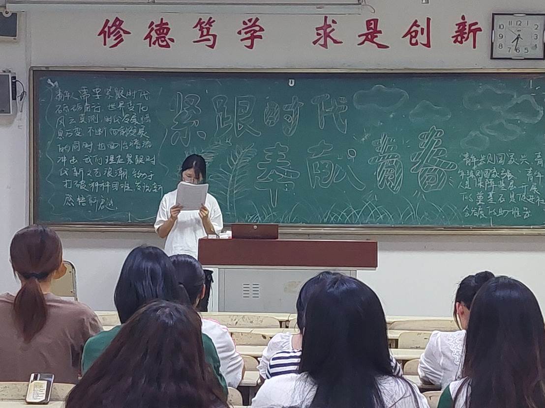 本次论坛以PPT和视频放映为主,以学生演讲、讨论为辅。各班黑板报特色鲜明、紧扣主题。其中,2021级特殊教育专业本科班高响的演讲从新时代、新青年、新担当讲起,条理清晰、逐渐深入,延伸至要以中华民族复兴为己任,号召青年行动起来,不负党和人民的希望,为祖国建设出一份力。2021级学前教育专业对口本班的黑板报内容丰富,主题鲜明,“紧跟时代,奉献青春”八个大字居于板报中央,象征着青春力量的一双双手托起党徽和国旗,表达了青年一代建设祖国,奉献祖国的坚定信念。论坛期间,同学们各抒己见,积极讨论,气氛活跃。