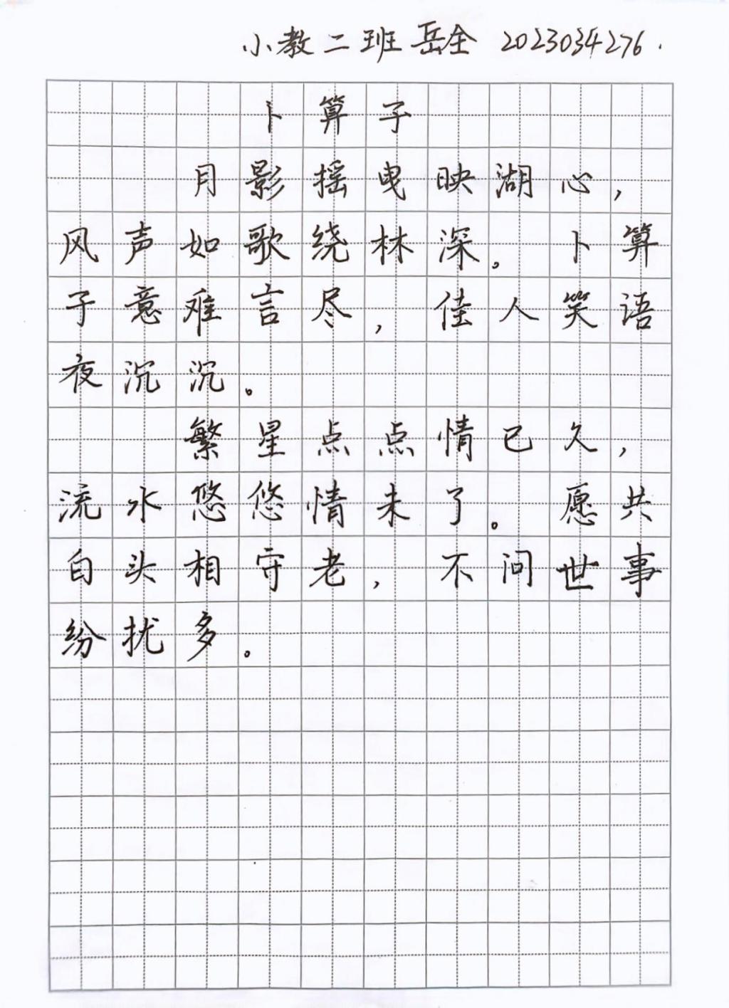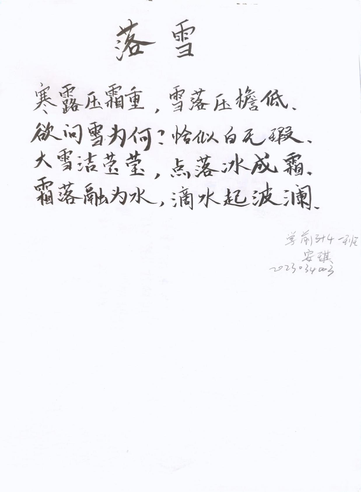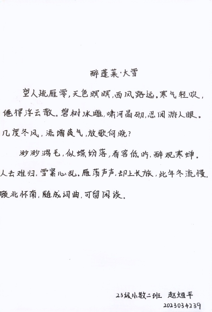 本次活动的参赛选手围绕“冬日”主题,采用不同形式的诗词题材进行创作。其中,2023级小学教育专业二班赵煊平的作品《醉蓬莱·大雪》向同学们呈现了一幅“渺渺鸿毛,似蝶纷落”的美丽景色,抒发了他对冬日雪景的热爱和赞美之情;2023级小学教育专业二班岳全的作品《卜算子》中生动形象地描写了萧条冷落的冬日夜景,使同学们仿佛身临其境。