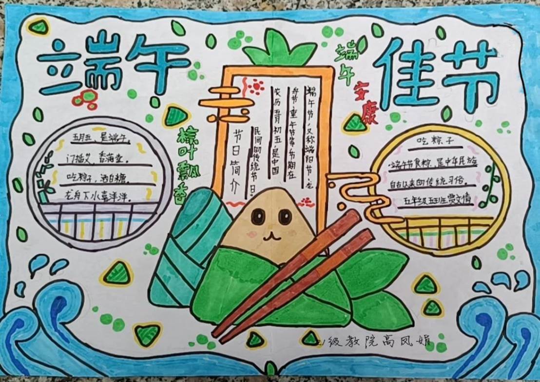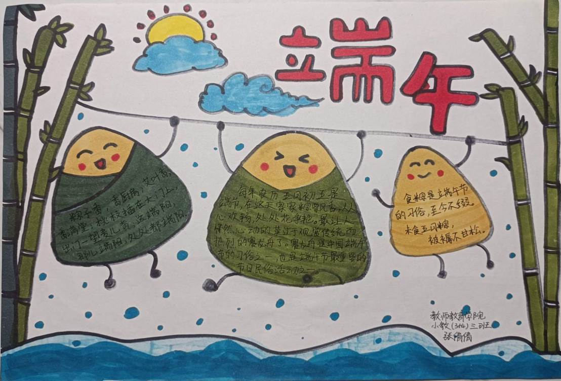 同学们以书法、绘画等传统艺术形式,生动展示我国传统文化习俗,让广大师生能够近距离感受传统文化的魅力,共同迎接端午佳节的到来。其中,2021级小学教育专业专升本二班高凤娟的作品以手抄报的形式呈现,上方“端午佳节”四个大字点明主题,中间形象生动的粽子惹人喜爱,两侧对端午节的由来以及传统习俗加以阐述,用笔墨丹青抒发对端午的热爱之情;2021级小学教育专业3+4三班张倩倩的手抄报,作品中三只快乐的粽子传递了喜迎端午的欢乐以及对节日的祝福,两侧的竹子则寓意着屈原高洁品质。