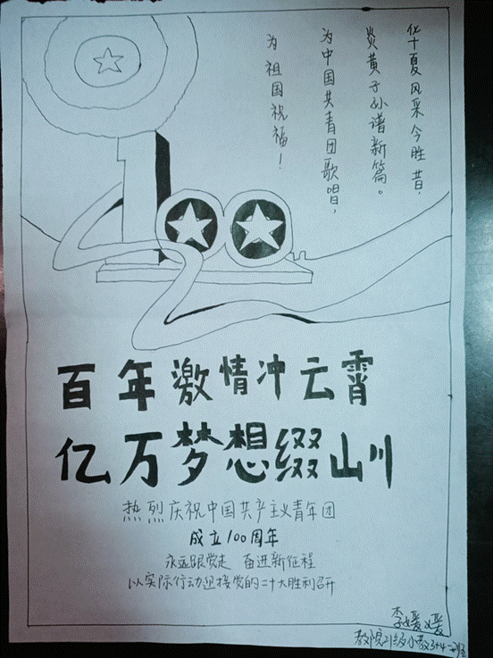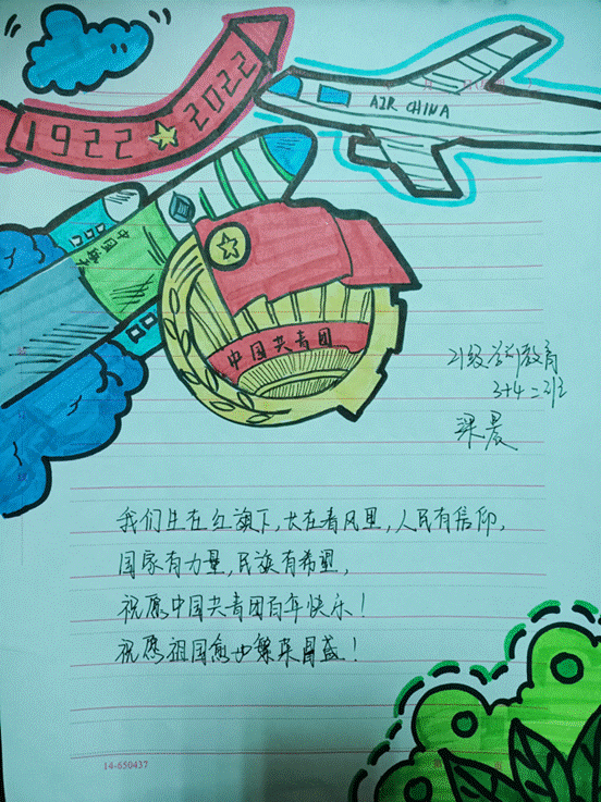 本次活动参与的同学在精心选择简洁美观的贺卡同时,也通过细致可爱的绘画对贺卡加以点缀。其中,2021级学前教育专业3+4二班的梁晨自制封面,图中的团徽熠熠生辉,加之中国近代科技的优秀成果使得整幅画面让人肃然起敬;2021级小学教育专业3+4二班的李媛媛以图配文的方式将建团历史详细的展现出来,与其题目“百年激情冲云霄,亿万梦想坠山川”交相辉映。负责人表示,希望大家在写下贺卡能够打破时空的壁垒,同时鼓励自己在今后的学习中不忘初心,发扬风格。