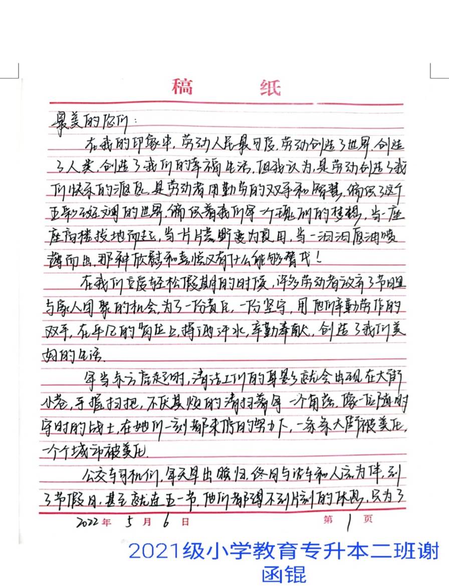 本次活动同学们以书信的方式从不同角度对劳动光荣,劳动至上进行赞扬。所交作品内容丰富,形式多样。其中,2021级学前教育专业专升本三班王琰的作品立足当下疫情中舍小家顾大家的劳动人员,以平凡而又伟大的劳动事迹,展现出对劳动人民的敬仰之情;2021级小学教育专业专升本二班谢函锟的作品以从古至今延续的劳动文化和精神出发,展现了劳动精神的传承和发扬,鼓励同学们继承和发扬劳动精神,积极投身于劳动实践中去。