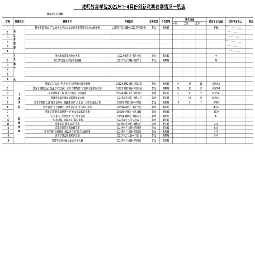 自2022年1月以来,我校共承办三项省级高水平赛事,组织开展16项校级赛事。其中,我院承办开展了菏泽学院“专业展精彩,激情创未来”教资知识竞赛和菏泽学院“迈向职场第一步”创新就业知识竞赛两项校级创新创业赛事。截止至4月份,我院创新创业工作取得了阶段性成就。我院学子积极参加各级各类创新创业活动,其中我院共有9人参加第七届菏泽市创业大赛,18人参加2022年全国大学生英语竞赛,2170人参加药学院组织开展的五项创新创业活动68人荣获一等奖121荣获二等奖139人荣获三等奖,1955人参加物理电子与工程学院组织开展的创新创业活动,6039人参加教师教育学院承办组织的创新创业活动,43人参加“心灵手巧,变废为宝”线下创新活动。
