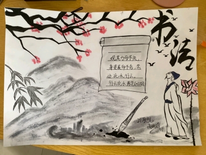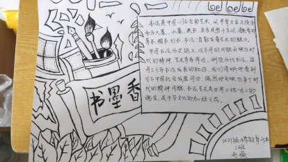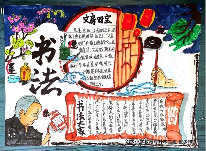 本次比赛以书画为主,激发同学们对书法与绘画的兴趣爱好,提高专业技能,同时为同学们提供展示自我的平台。其中,2021级小学教育专业专升本二班丁晓飞的作品映入眼帘的是“汉字之韵”四个大字,线条流畅,字里行间浑厚有力,透露出坚实的书法功底,同时汉字四周绘画出的竹子使手抄报充满了古韵的气息。2021级小学教育专业专升本二班张少艳的作品色彩鲜艳,作品下方绘画出年长的老人执笔写书法的场景,同时将书法以书卷的形式呈现给读者,作品上方的梅花图像与“文房四宝”文字相结合更是突出了书画的主题。