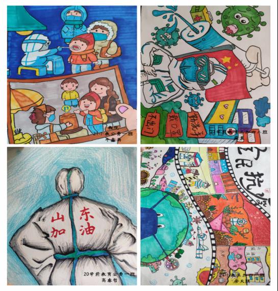 本次活动同学们积极参加,作品内容丰富,紧扣主题,从同学们工整美观的画面中可以感受到在疫情下仍有温暖存在,其中,2021级小学教育公费一班牛鑫雨的作品描绘了大家有序做核酸的画面,主题突出,富有情趣,具有较强感染力和表现力;2021级学前教育三加四二班梁晨同学通过鲜艳的五星红旗、全副武装的抗疫人员来描绘自己眼中的抗疫精神,别出心裁,富有创意,从别样的角度展现对抗疫英雄的崇高的敬意。