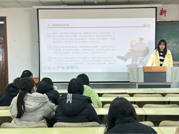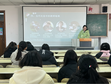 本次活动以深入理解教师职业内涵为目的,同学们通过讲解PPT进行分享。其中,2023级特殊教育专业本科班的刘黛慧从教师的起源和意义讲起,通过列举当代教师楷模,强调了教师在国家和社会的发展中的重要作用;2021级学前教育专业3+4二班的安珊带领同学们观看了相关视频,直观地感受了古往今来教师地位的变化,呼吁同学们要讲好师德故事,弘扬师德风范。
