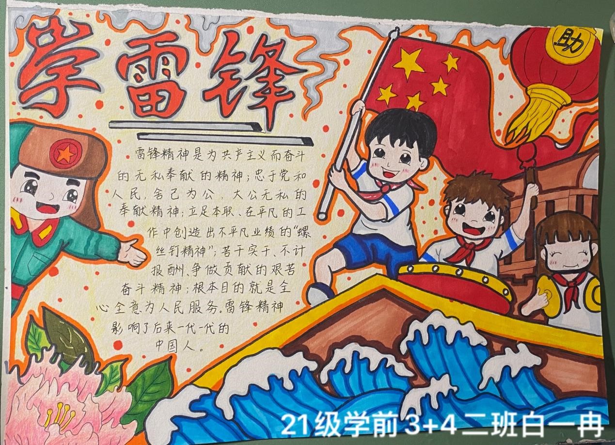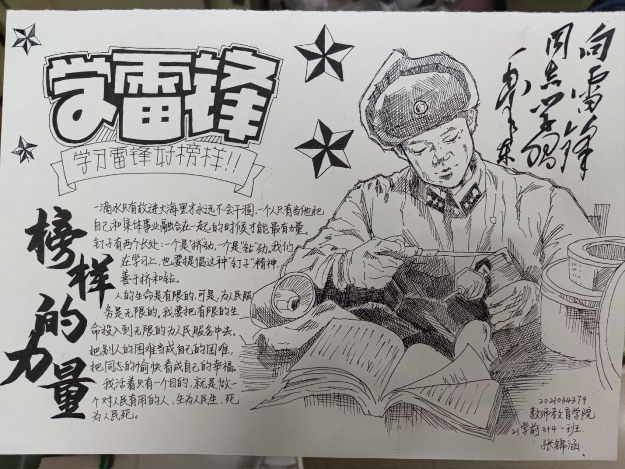 本次活动,参赛选手将绘画与书法艺术相结合,上交作品形式多样,内容丰富,充分表达出雷锋精神永不褪色的时代意义。其中,2022级学前教育专业3+4一班的崔昕语以“弘扬雷锋精神,争做时代新青年”为主题,呼吁当代新青年不忘雷锋精神,继承革命信仰,积极投身于中华民族伟大复兴的中国梦中去;2021级学前教育专业一班的张锦涵以“学习雷锋好榜样”为主题,以独特新颖的画风展现了当代大学生以雷锋同志为榜样,用实际行动继承和发扬雷锋精神的时代内涵,激励同学们将雷锋精神内化于心,外化于行。