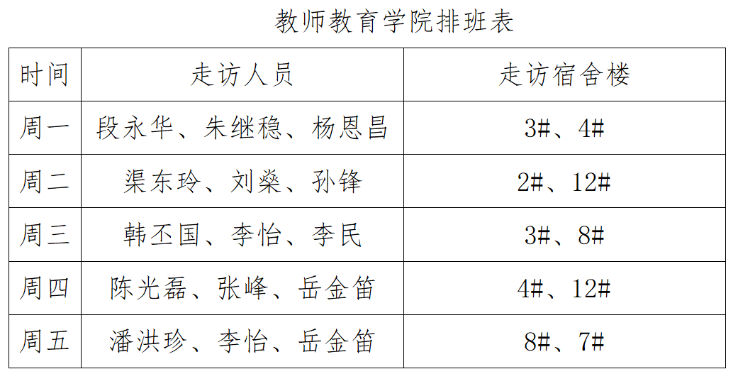 为全面了解疫情防控下学生宿舍内务和线上学习生活状况,保障学生身心健康,做好学生思想工作,教师教育学院领导老师分为五个小组,每天对宿舍进行走访。