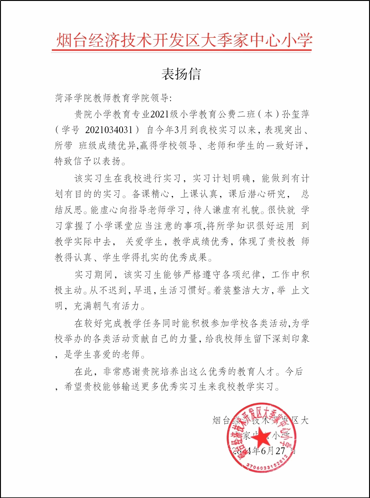 6月27日,我院收到来自烟台经济技术开发区大季家中心小学对2021级小学教育专业公费二班孙玺萍在实习期间表现优异的一封表扬信。