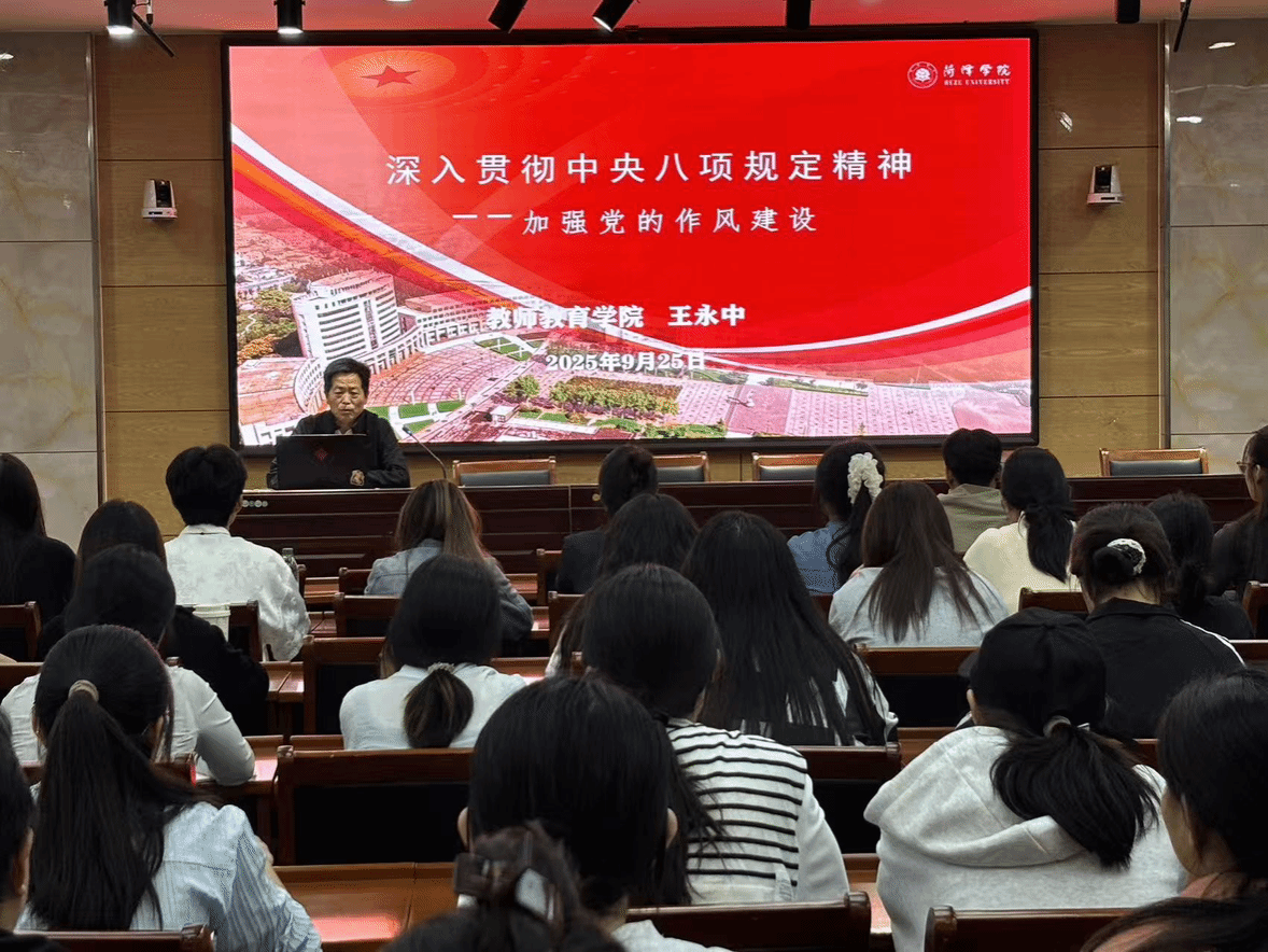 9月25日晚,我院在教师教育博物馆108室举行专题党课培训。党委书记王永中以“深入贯彻中央八项规定精神——加强党的作风建设”为题,为全体入党积极分子讲授了一堂内容丰富、意义深刻的专题党课。