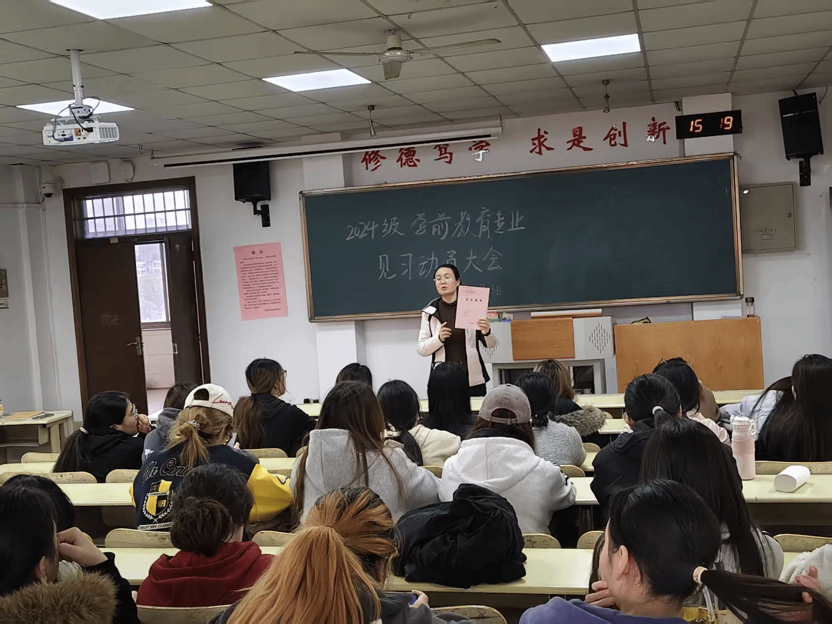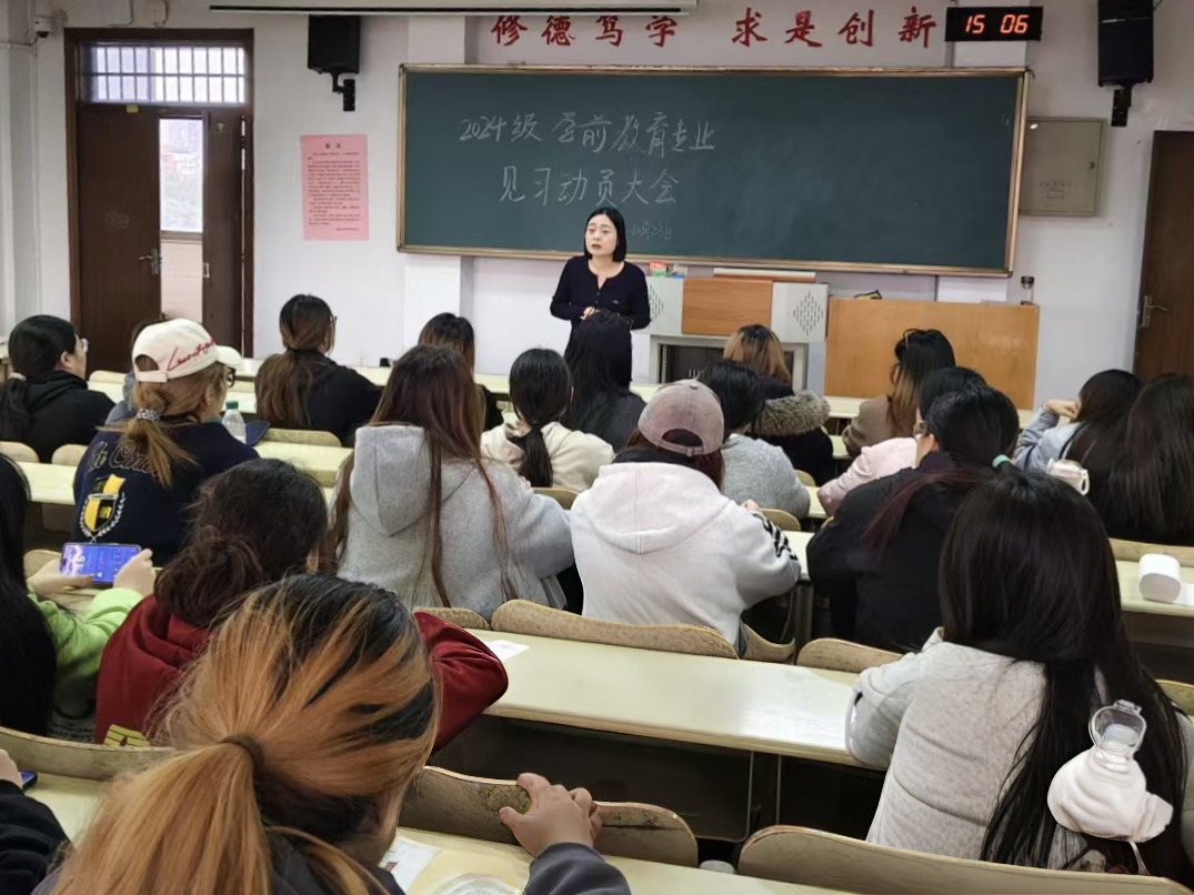 10月23日下午,我院2024级学前教育专业见习动员大会在8号教学楼414教室顺利召开。大会由学前教育系主任霍艳芳、副主任陈德艳共同主持,2024级学前教育专业全体学生参加。