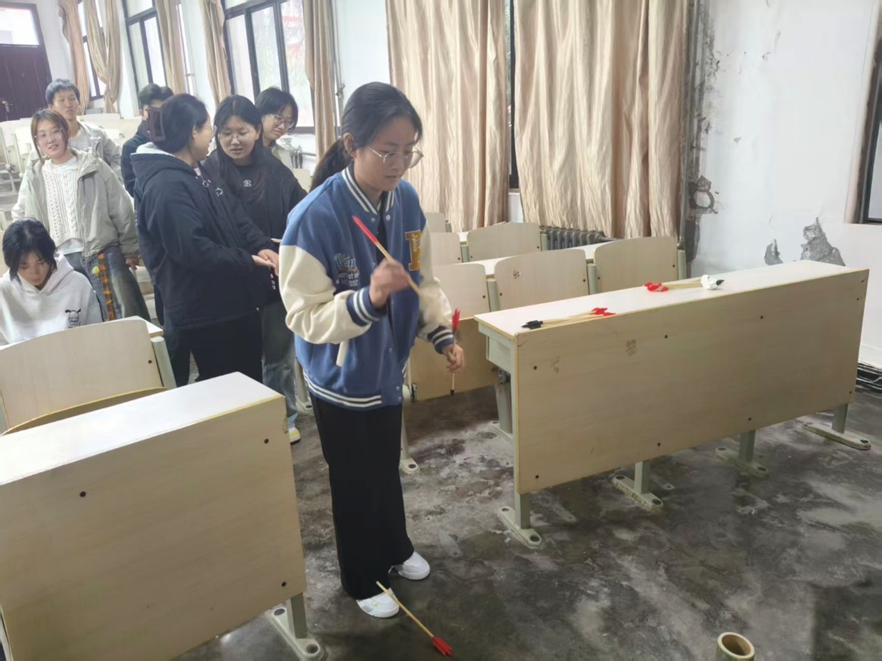 活动现场气氛热烈,文化韵味浓厚。投壶体验区吸引了同学们驻足尝试。大家在此起彼伏的喝彩声与鼓励声中,亲身感受投壶游戏的独特魅力,体会古人寓礼于乐、张弛有度的智慧。传统文化问答区同学们围绕中华历史、民俗、文学、艺术等广泛内容展开思维碰撞,在紧张有趣的竞答中深化了对传统文化知识的理解与记忆。