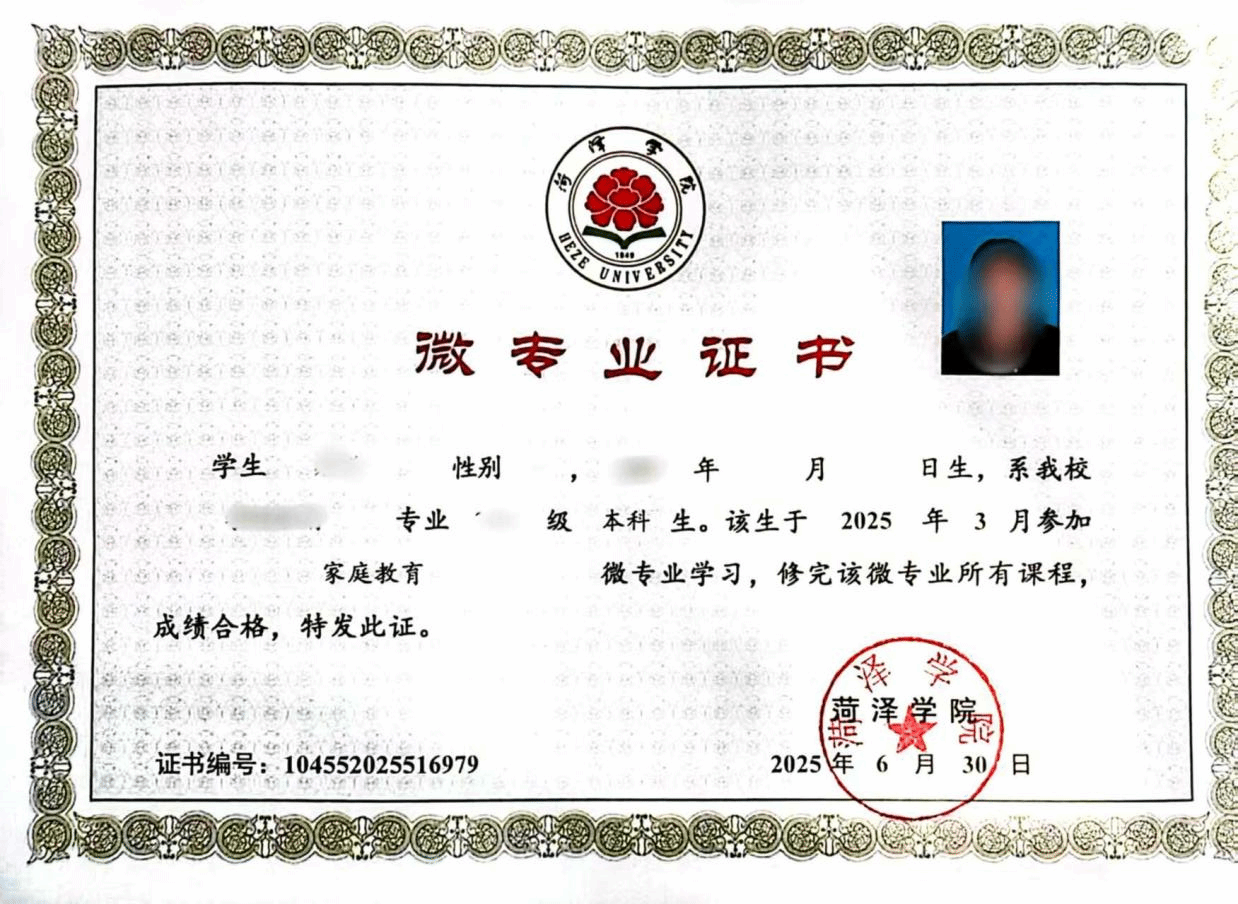 学生修完本微专业全部课程并通过考核,达到15学分要求后,由菏泽学院颁发“家庭教育”微专业证书,证书信息纳入学校学籍管理系统,教育部备案,学信网可查询。