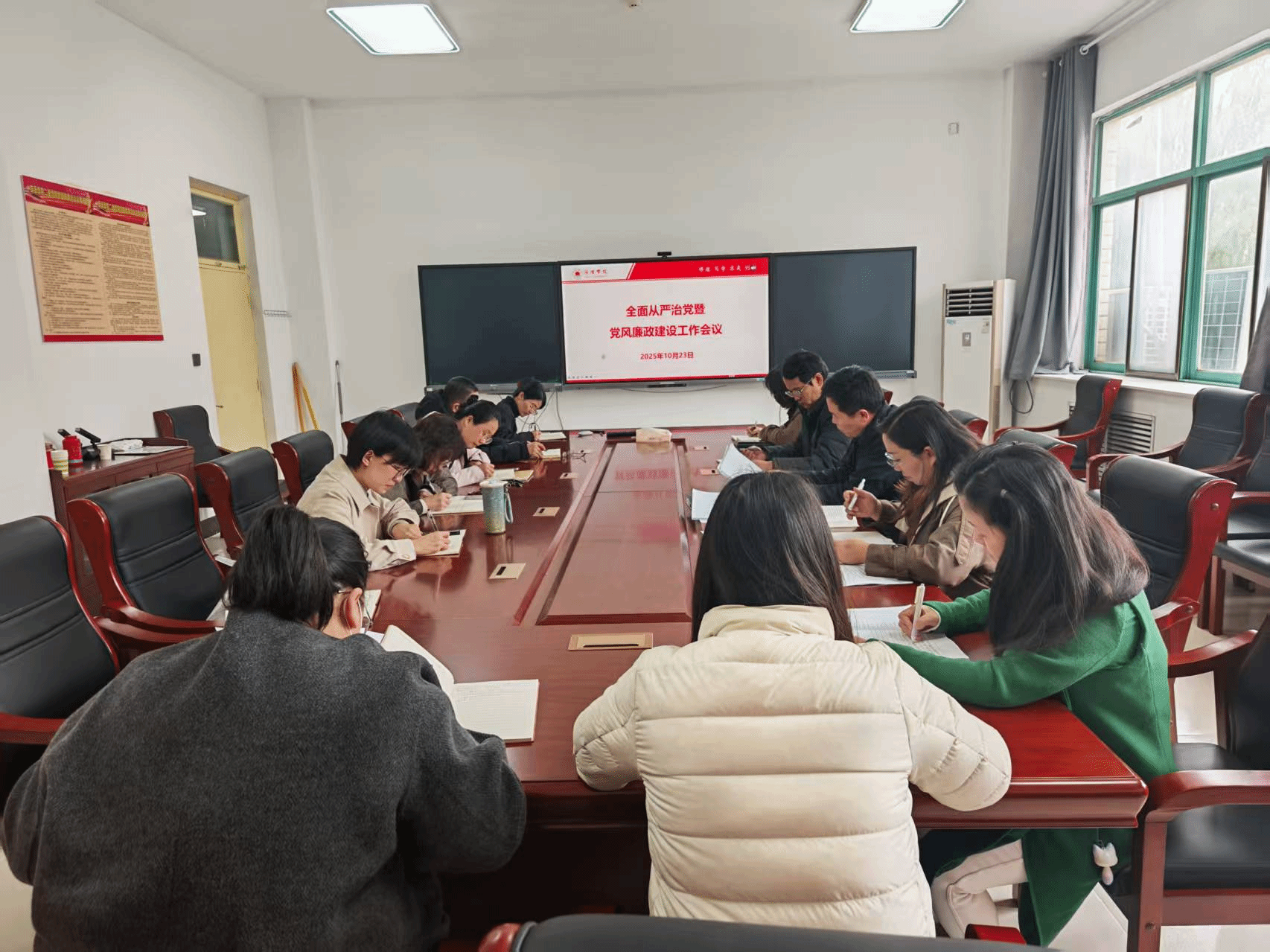学院党委副书记李婷领学习近平总书记关于全面从严治党工作的重要论述,重点解读《习近平总书记关于党的建设的重要思想概论》第十章“坚持持之以恒正风肃纪”、第十三章“坚持一体推进不敢腐、不能腐、不想腐”的核心内容,深刻阐释全面从严治党与教育事业发展的内在联系。随后,李婷传达《中共菏泽学院委员会关于推进全面从严治党主体责任落实的若干措施》(菏院党字〔2025〕26号)文件精神,结合教师教育学院工作实际,重点解读文件在师德师风建设、招生就业监管等领域的具体要求,强调要以文件为指引,将全面从严治党要求贯穿教育教学全过程。与会人员一致认为,全面从严治党是保障教育事业健康发展的根本保证,事关教师队伍建设质量、人才培养廉洁底色及学院发展方向,必须以“严”的基调推动工作走深走实。