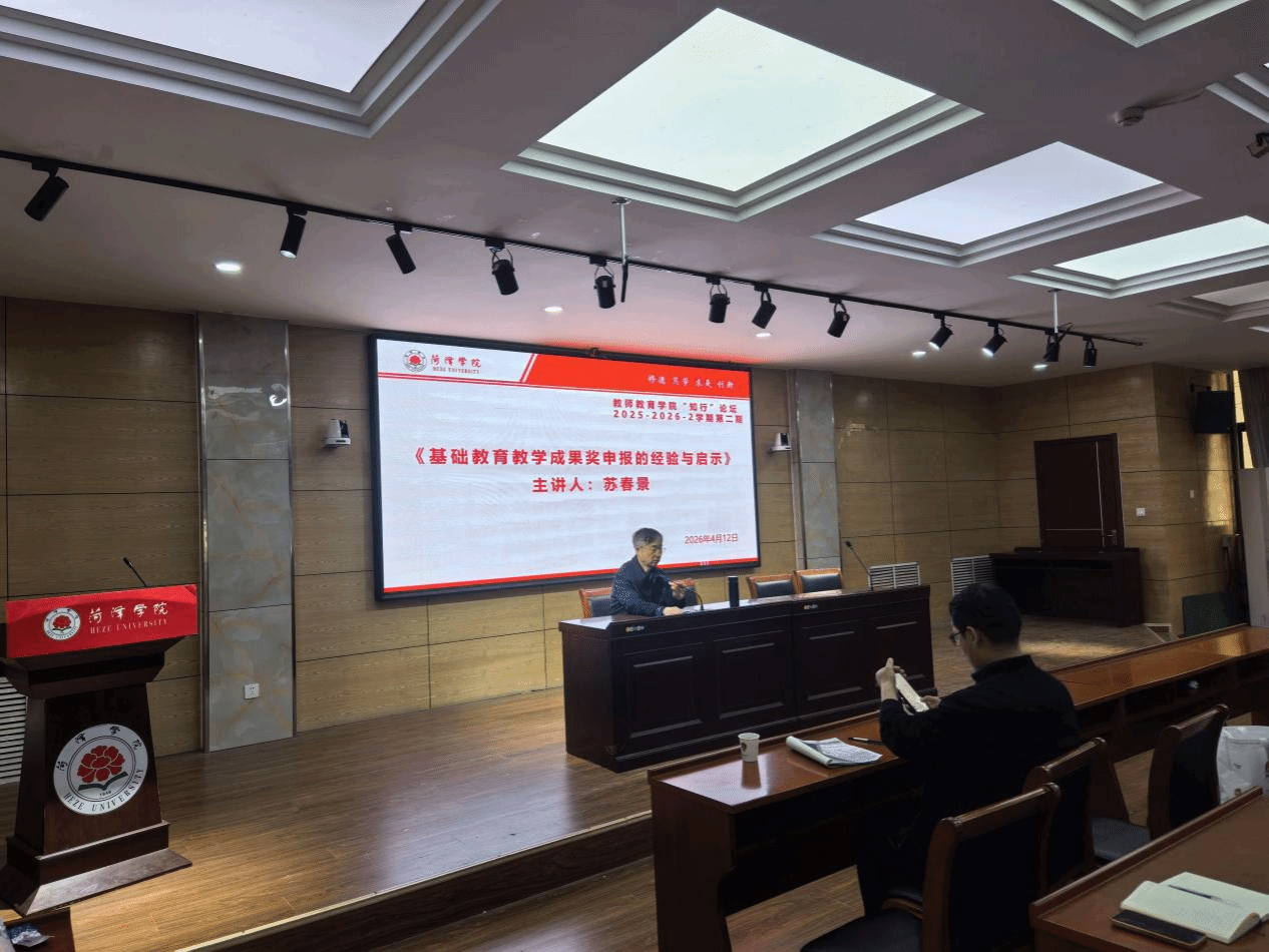 苏春景教授以《基础教育教学成果奖申报的经验与启示》为题,围绕申报常见问题与应对策略展开深入讲解。他剖析了申报材料中存在的“十大毛病”,并针对性提出“十有”申报标准。同时,结合少子化、人工智能冲击等前沿议题拓展分析,强调要破解“两张皮”“三分离”等现实困境,推动研训一体化发展。报告内容丰富、案例详实,为教师提供了极具操作性的指导。论坛结束后,苏教授在4号教学楼312会议室,对陈德艳老师的教创赛申报材料进行专题指导,从逻辑结构、内容表述、亮点提炼等方面提出具体修改意见。