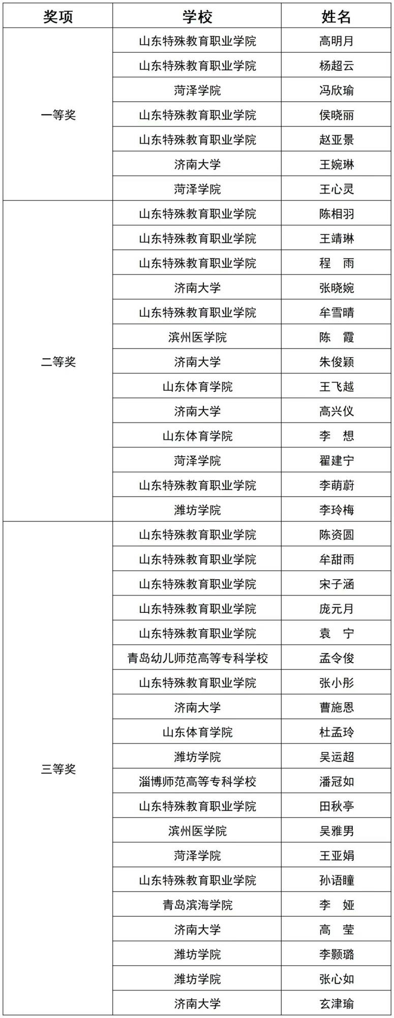 山东省第二届高校特殊教育康复技能大赛获奖名单