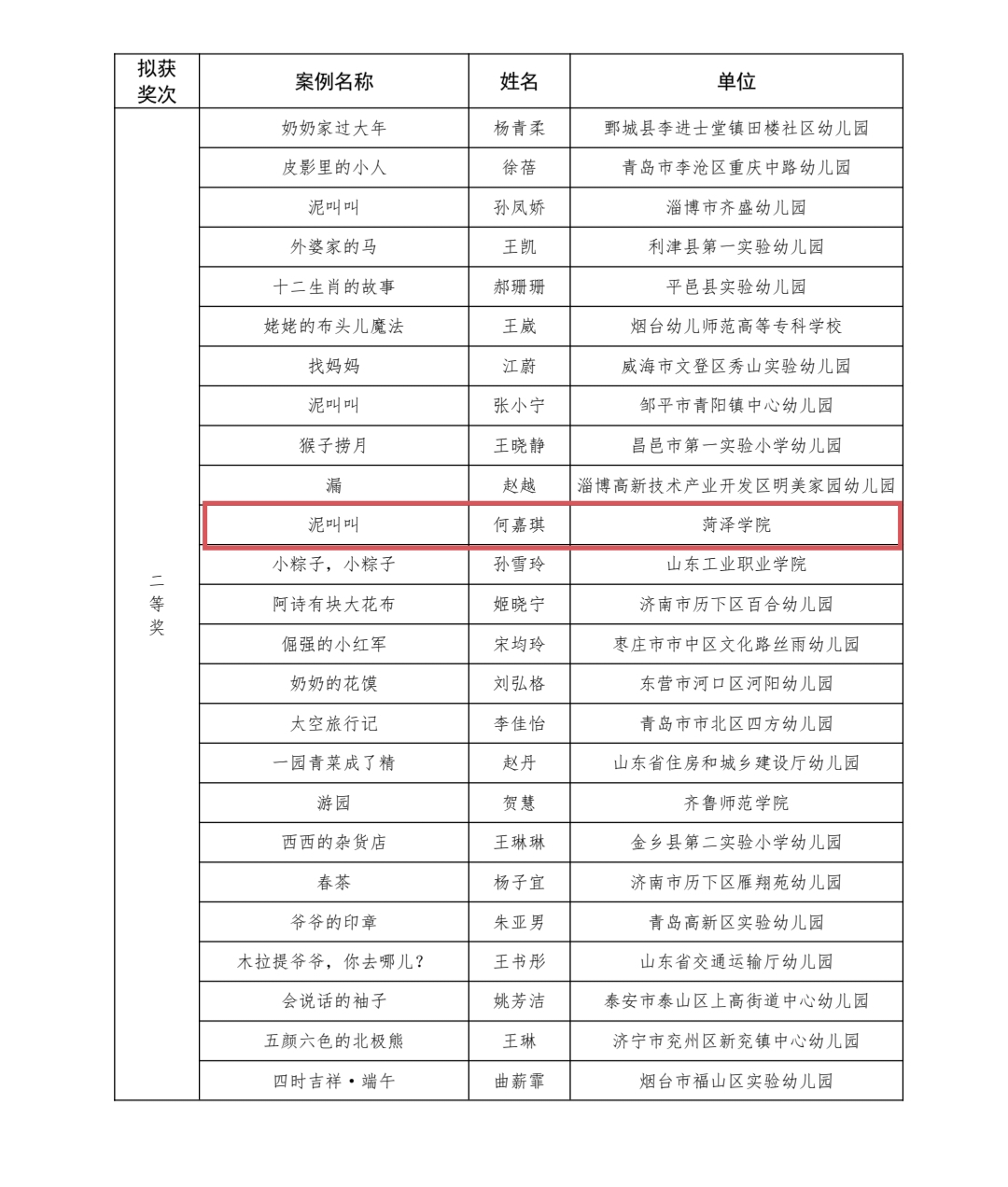 我院学前教育专业学子在本次比赛中荣获二等奖1项,三等奖1项,展现了我院学前专业高质量育人成果。其中,2022级学前对口班何嘉琪同学(指导教师:霍艳芳)的作品《泥叫叫》荣获二等奖,2022级学前(3+4)三班侯倩倩同学(指导教师:霍艳芳)的作品《影子爷爷》荣获三等奖。
