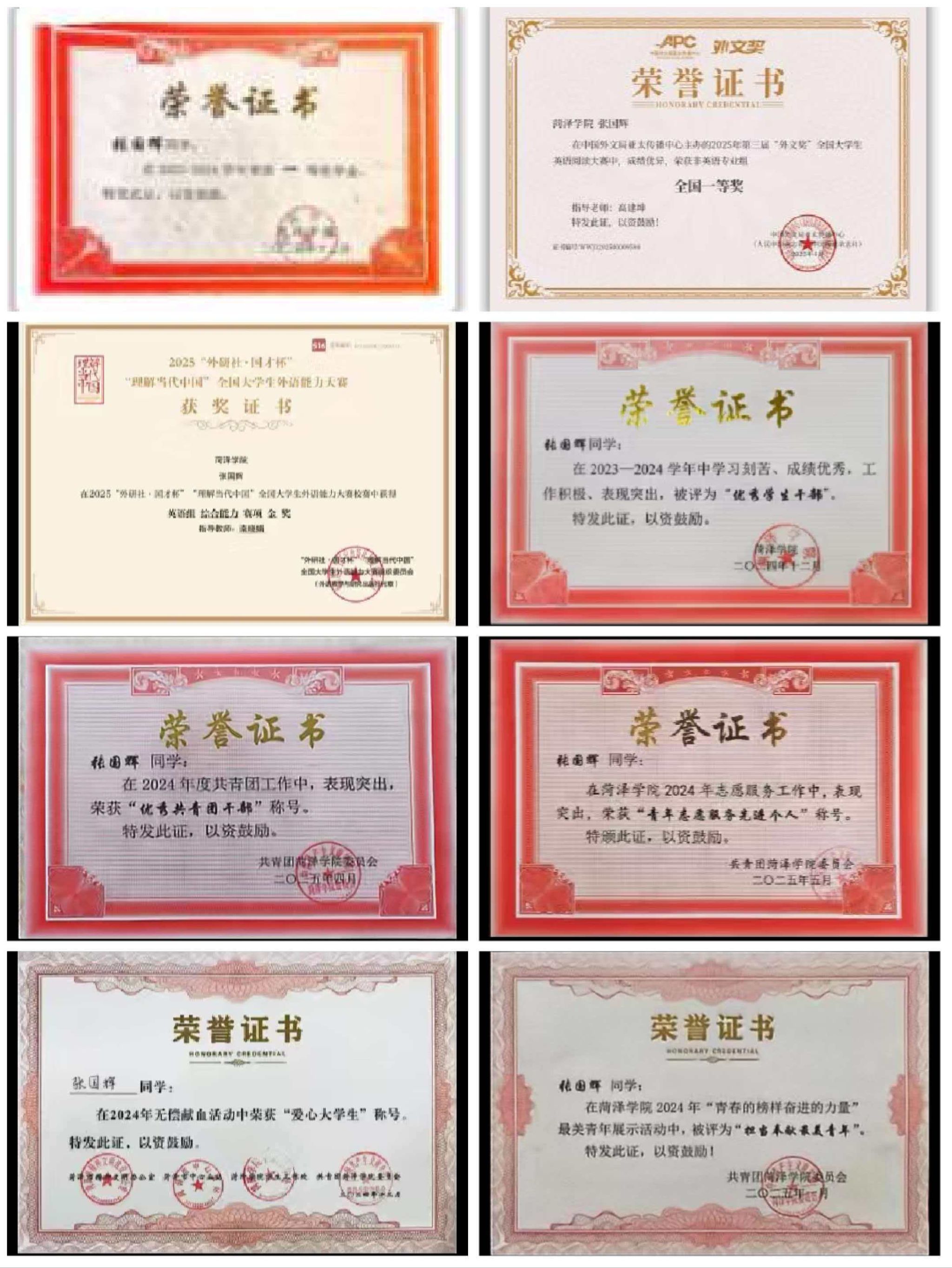 自踏入大学校园以来,始终以严谨认真的态度对待每一门学科。课堂上,紧跟老师思路,精准把握学习重点;课后,不断探索优化学习方法,着力深化专业知识的掌握程度。上一学期,原始成绩平均分达92.49分,专业排名稳居第1/91,凭借优异的学业表现,于2024年12月斩获菏泽学院2023-2024学年校级一等奖学金,同时被评为该学年优秀学生干部。在校期间,先后考取计算机二级证书、普通话二级甲等证书、英语四级证书、高校心理委员工作平台MOOC培训合格证书,第一批家庭教育微专业毕业生,以扎实积累筑牢成长根基。