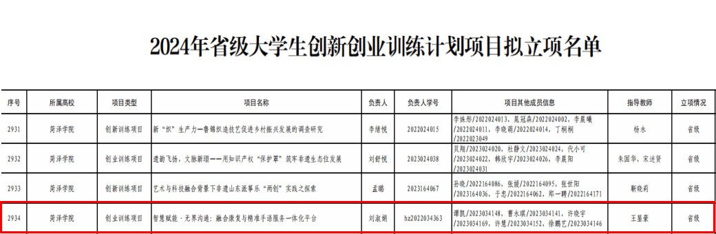 4.作为项目负责人,主持项目获2024年山东省大学生创新创业训练计划省级立项。
