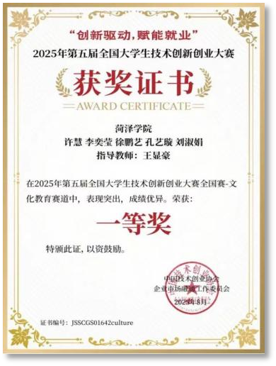 8.2025年第五届全国大学生技术创新创业大赛全国赛—文化教育赛道中,参赛项目荣获全国赛一等奖。