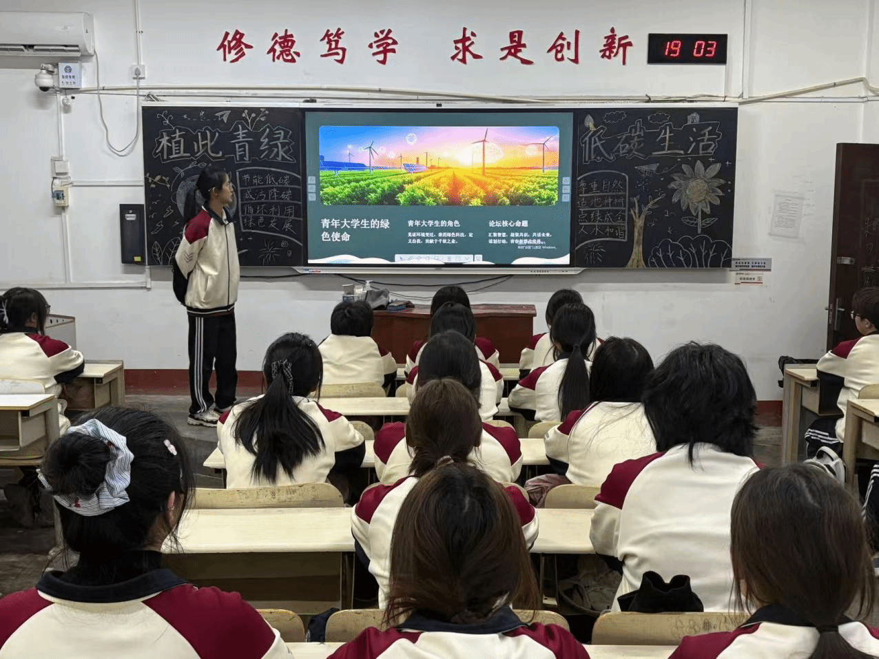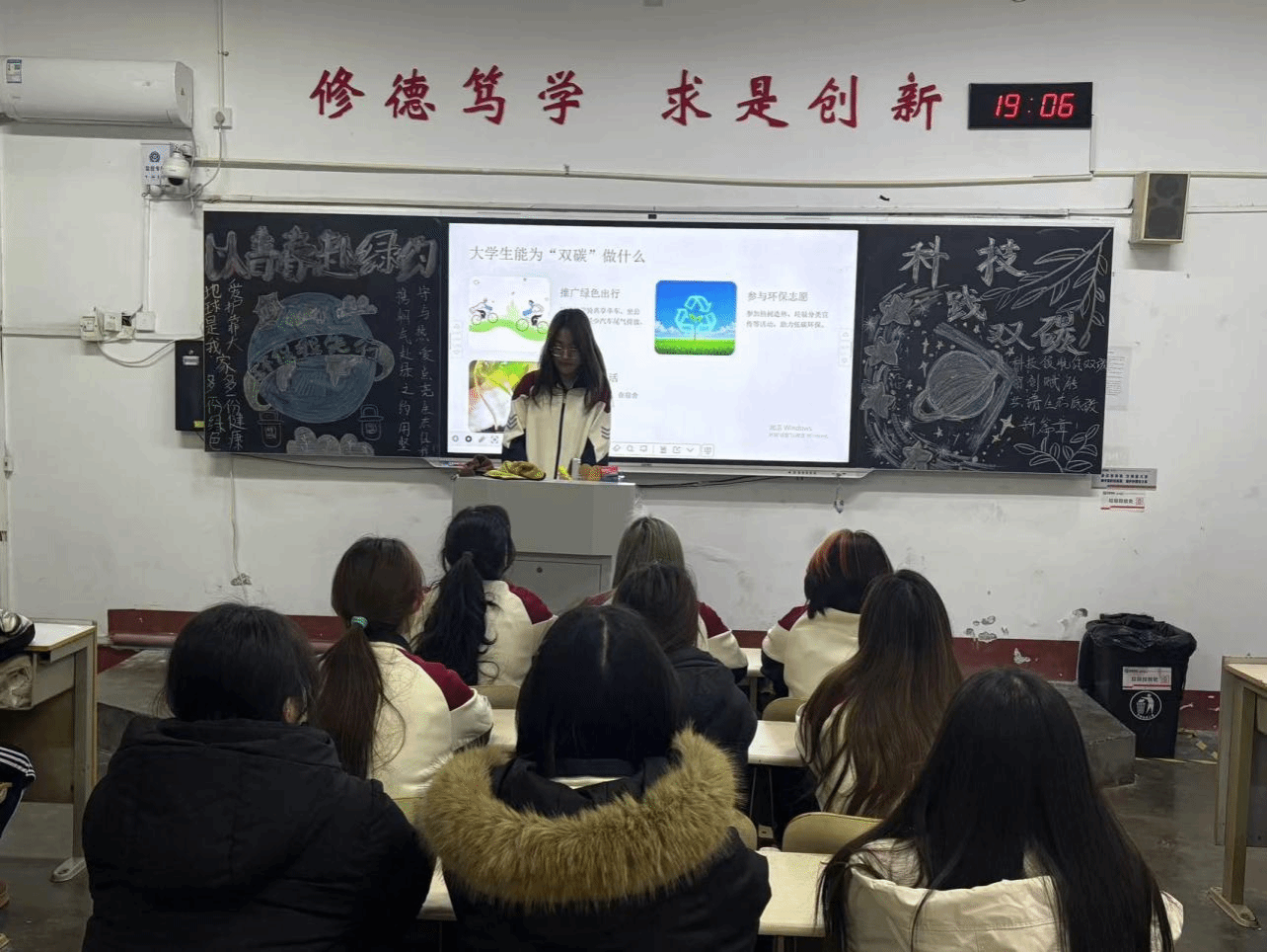 本次周日论坛,各班主讲同学仪态端正、表达清晰流畅,案例生动、重点突出。现场听讲同学专注投入、认真思考,积极互动交流。其中,2025级小学教育专业夏本班的周子涵围绕“草木蔓发,青春碳索”的主题,将“双碳”战略部署与高校育人、青年担当紧密结合,引导同学们深刻把握绿色科技发展方向,凝聚助力“双碳”目标的青春共识。2025级学前教育专业春本班王雪逸从节约教具耗材、优化课堂用电等细节出发,引导大家理解双碳目标落实在日常的意义,在轻松的互动中传递了小行动汇聚大能量的低碳理念。