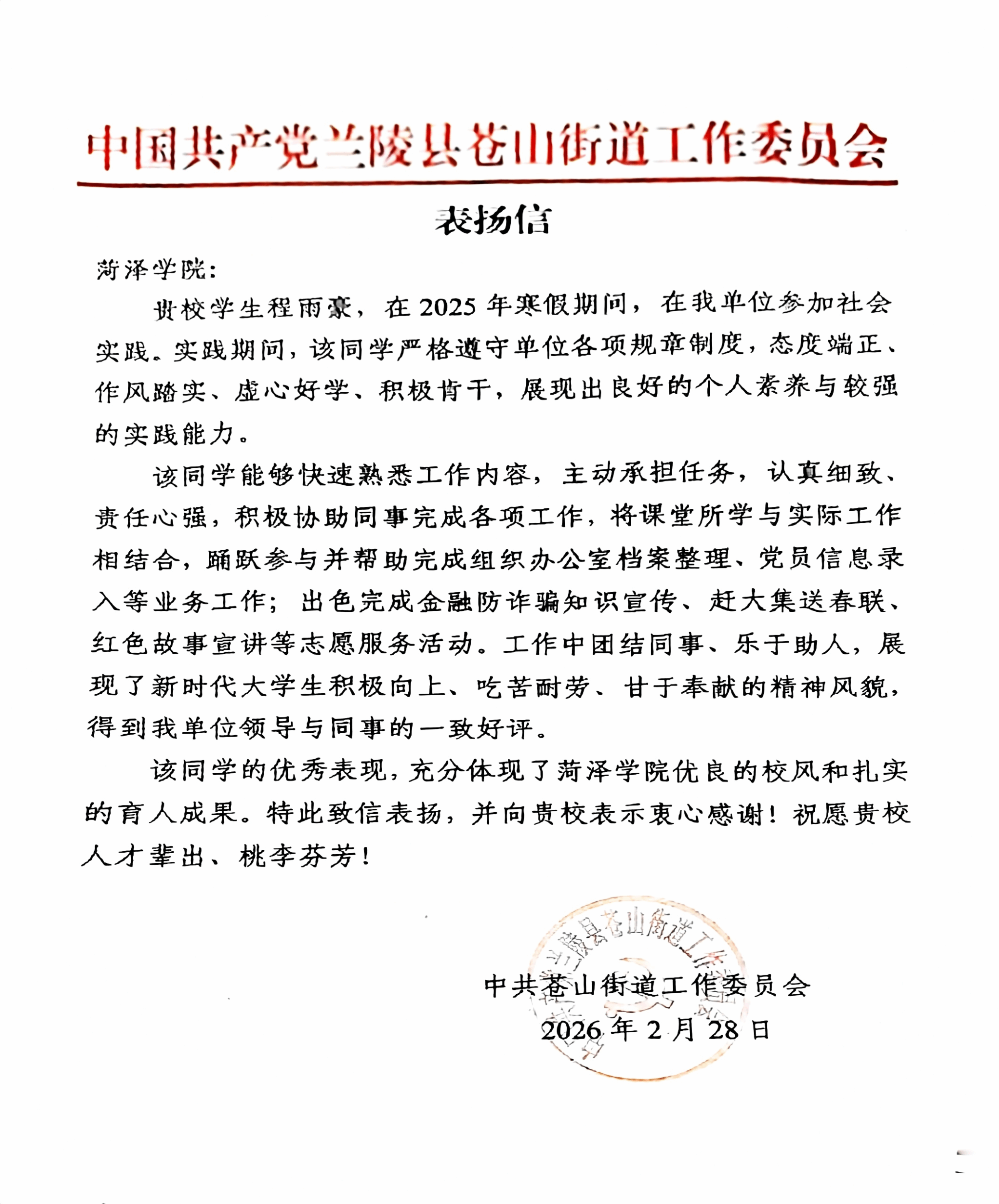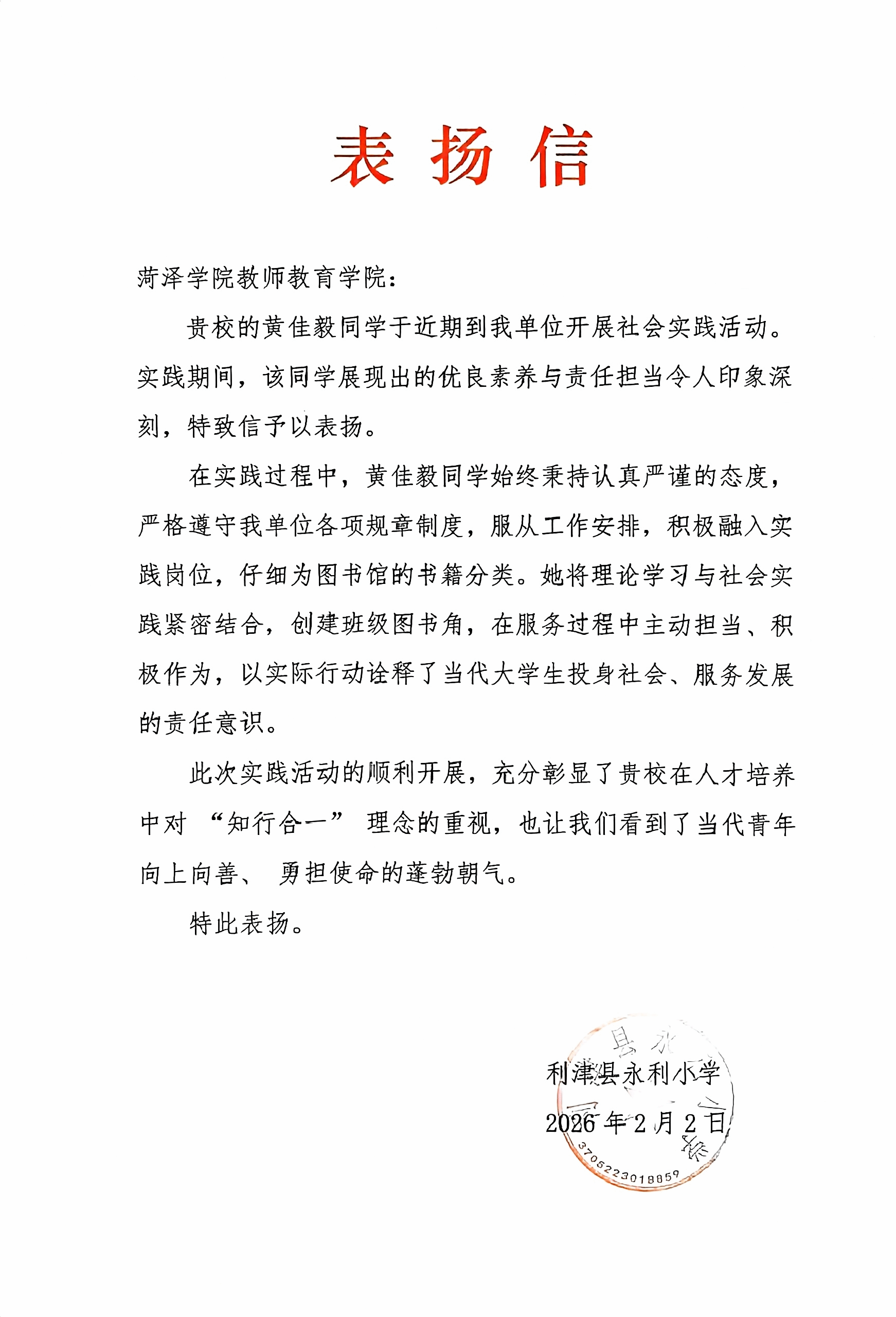 近日,我院2024级小学教育专业三班程雨豪同学、2025级小学教育专业专升本四班黄佳毅同学,分别收到来自兰陵县苍山街道办事处、利津县永利小学的表扬信,对他们在寒假社会实践中的突出表现给予高度肯定。