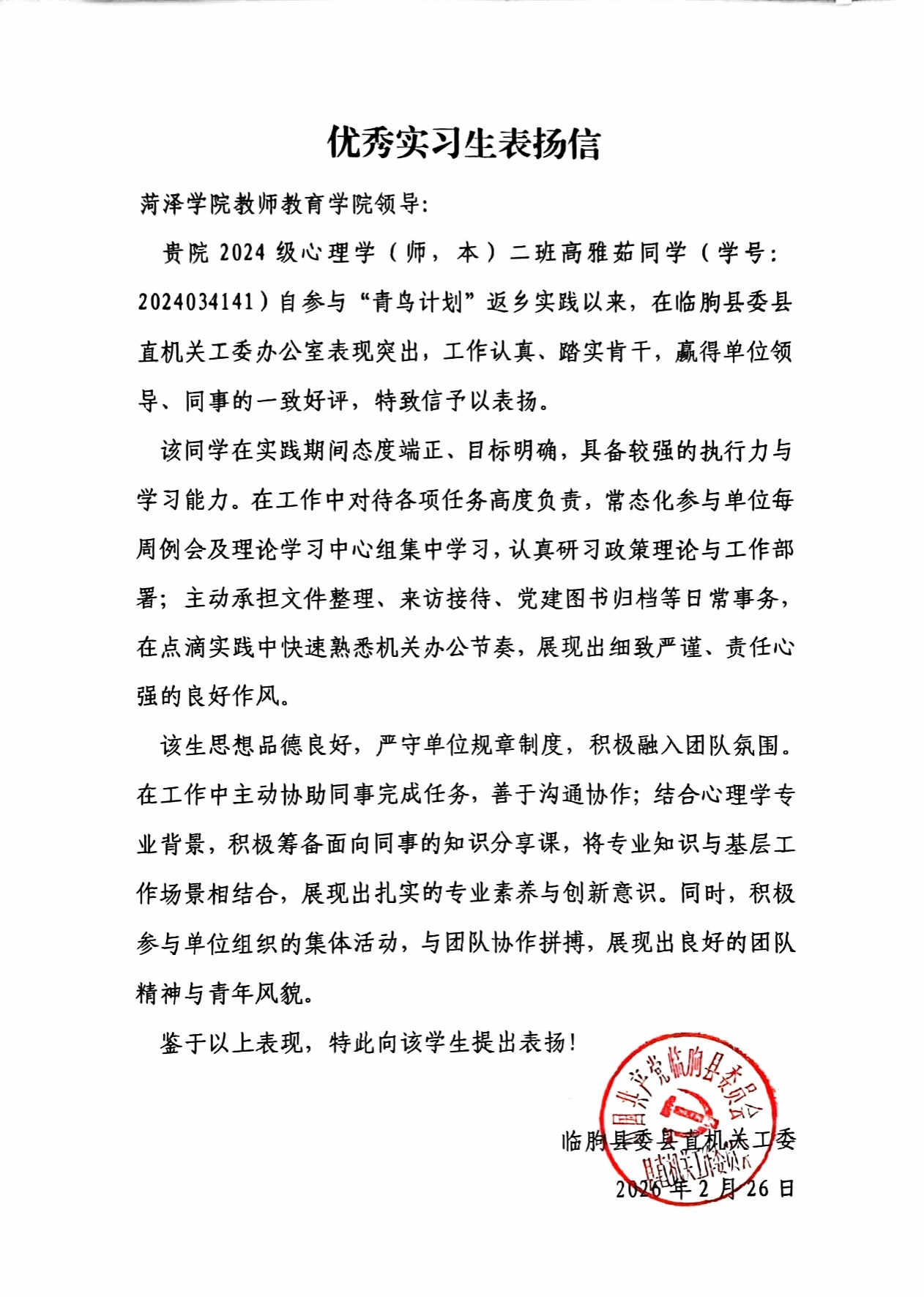 近日,我院2024级心理学专业二班高雅茹收到来自潍坊市临朐县委县直机关工委的《优秀实习生表扬信》,对其在“青鸟计划”返家乡社会实践期间的突出表现予以肯定和表扬。
