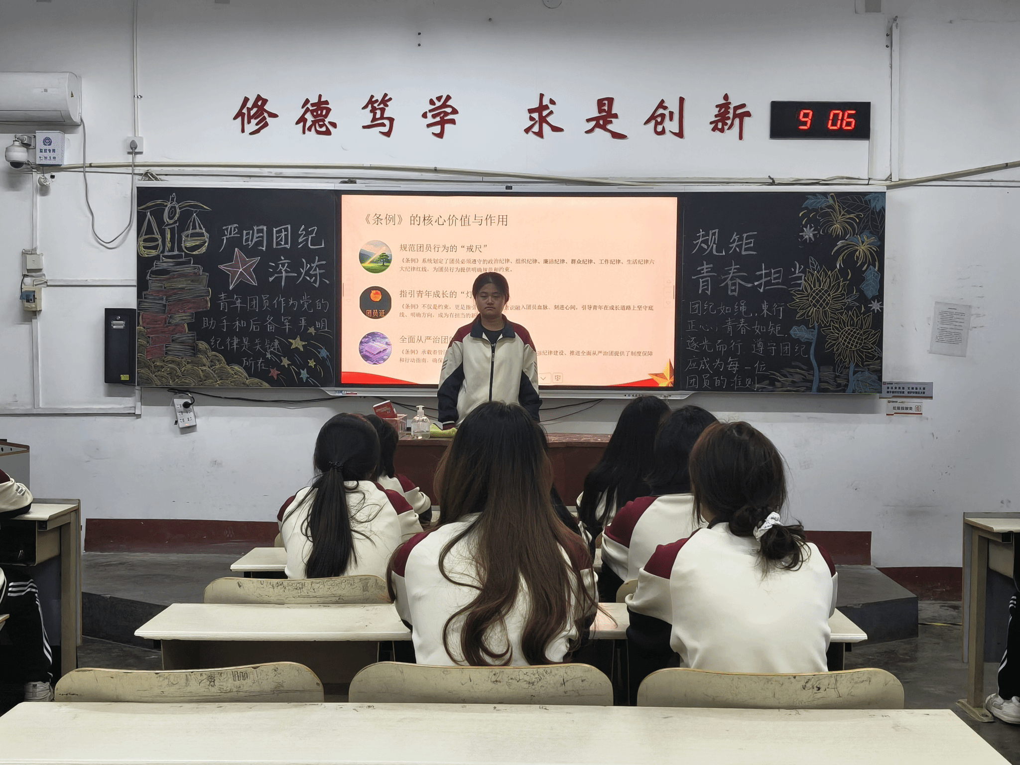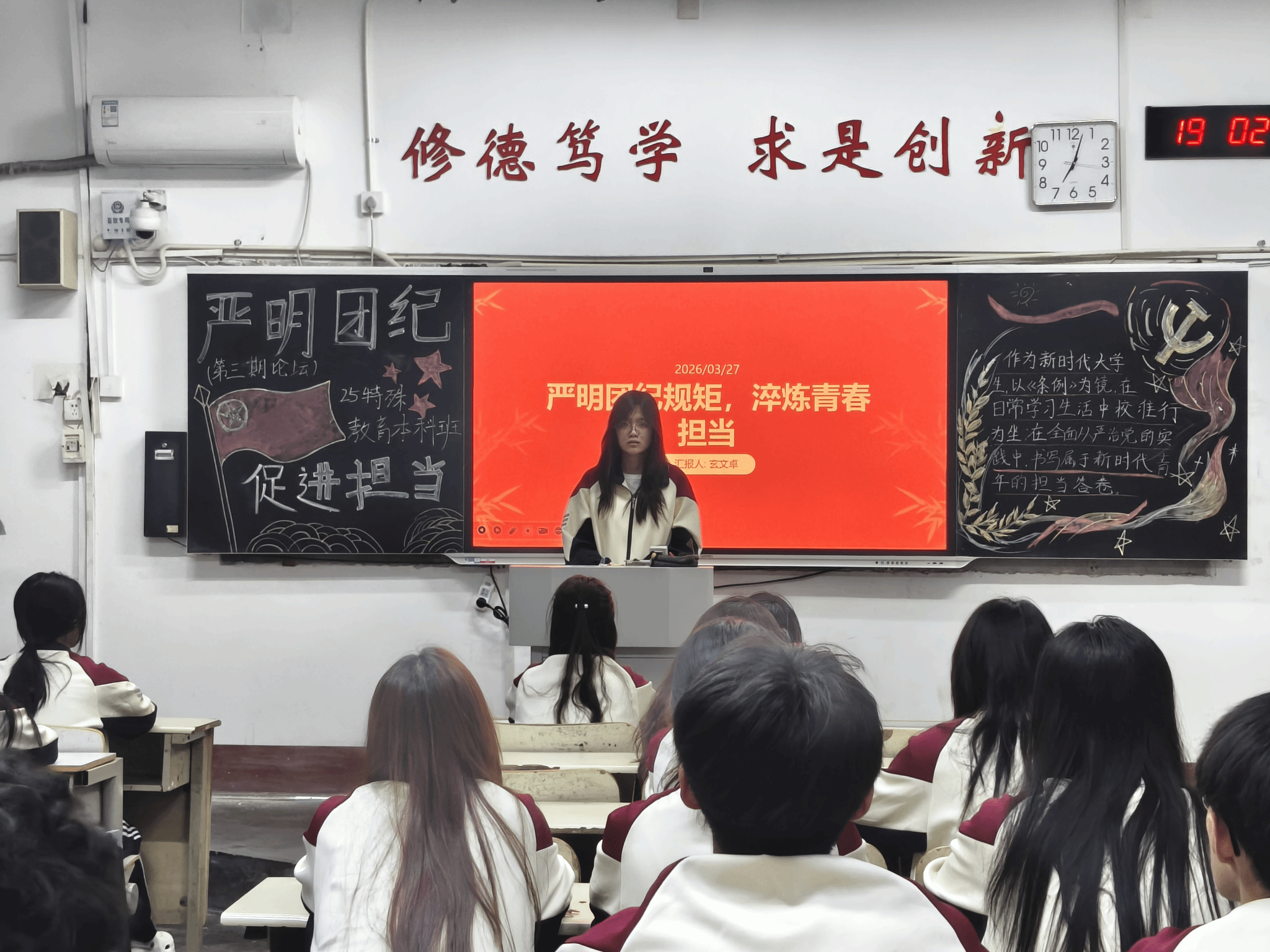 本次周日论坛形式新颖、内涵丰富,紧扣从严治团与纪律建设核心。各班主讲同学仪态大方、逻辑清晰,案例生动、解读深入。其中,2025级小学教育专业夏本班辛海燕围绕“严明团纪规矩,淬炼青春担当”主题,聚焦《中国共产主义青年团纪律处分条例(试行)》的学习践行,秉持筑牢纪律底线、强化责任担当的理念,引导团员青年将规矩意识融入日常。2025级特殊教育专业本科班玄文卓以互动问答、情景模拟等形式,围绕团纪规矩的时代价值、大学生践行纪律要求的实践路径等关键问题展开分享,在沉浸式交流中深化大家对团规团纪的认知,倡导主动学习条例、参与纪律实践,携手厚植纪律自觉根基,让从严治团的精神力量滋养每一位同学。