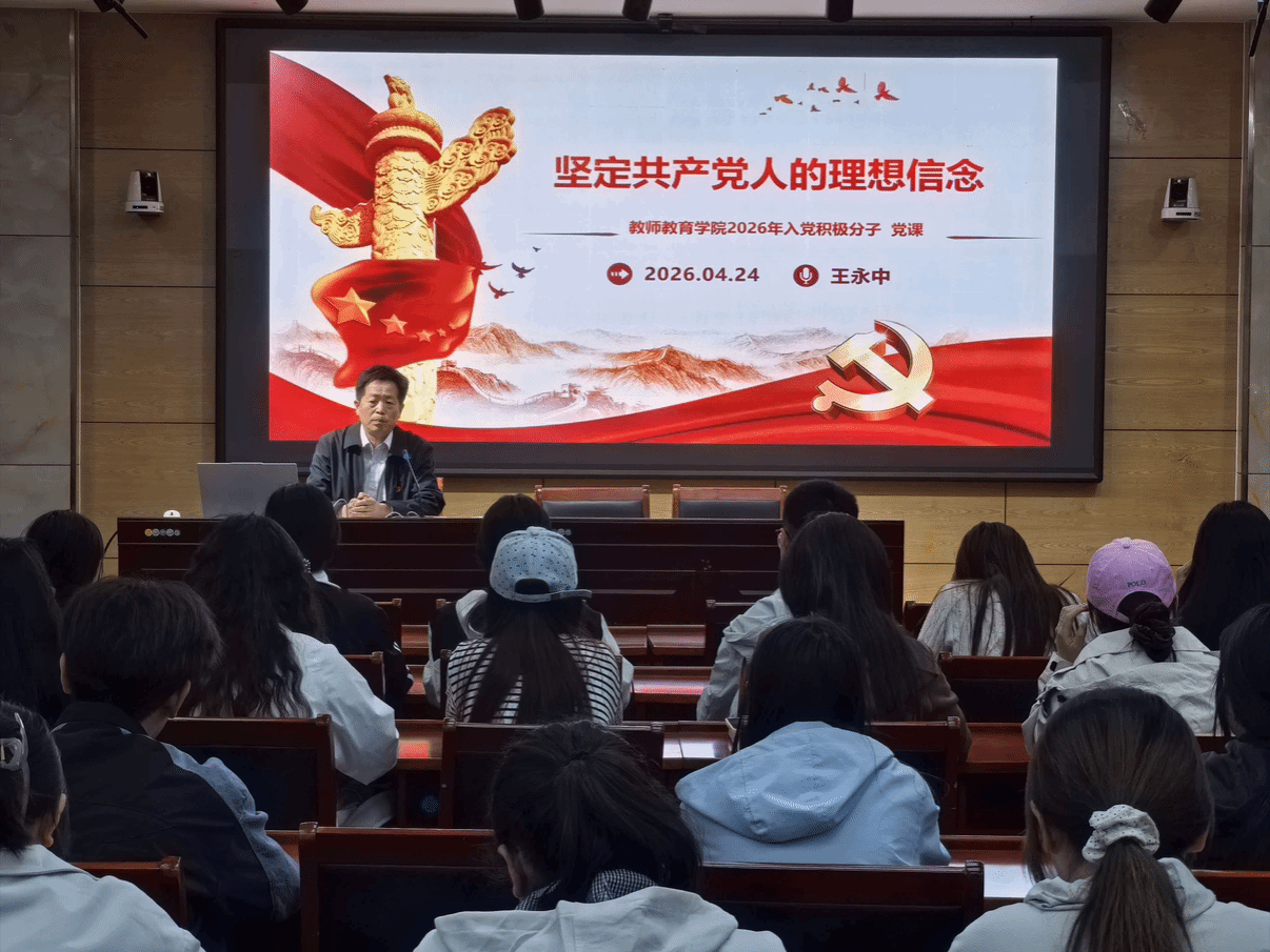 4月24日晚,我院2026年第1期入党积极分子专题党课在教师教育博物馆108室举行。我院党委书记王永中以《坚定共产党人的理想信念》为题,为全体入党积极分子讲授了一堂内涵丰富、思想深刻的专题党课。